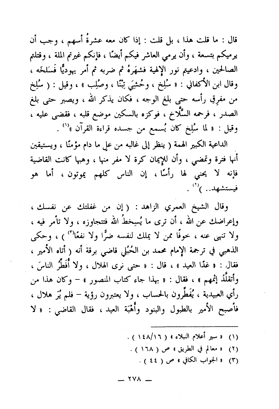 وقال الشيخ العمرى الزاهد: (إن من غفلتك عن نفسك، وإعراضك عن الله، أن ترى ما يُسِخطُ الله فتتجاوزه، ولا تأمر فيه، ولا تنهى عنه، خوفًا ممن لا يملك لنفسه ضرًّا ولا نفعًا (¬3))، وحكى الذهبي في ترجمة الإمام محمد بن الحُبُلي قاضي برقة أنه (أتاه الأمير، فقال: "غدًا العيد"، قال: "حتى نرى الهلال، ولا أُفَطِّرُ الناسَ، وأتقلَّدُ إثمهم"، فقال: "بهذا جاء كتاب المنصور" -وكان هذا من رأي العبيدية، يُفَطِّرون بالحساب، ولا يعتبرون رؤية- فلم يُرَ هلال، فأصبح الأمير بالطول والبنود وأهْبَةَ العيد، فقال القاضي: "لا