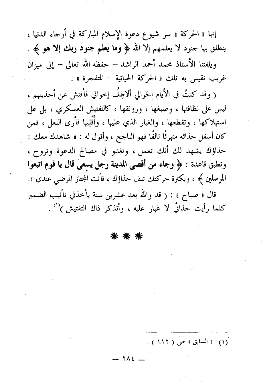 (وقد كنتُ في الأيام الخوالي ألاطِفُ إخواني فأفتش عن أحذيتهم، ليس على نظافتها، وصبغها، ورونقها، كالتفتيش العسكري، بل على استهلاكها، وتقطعها، والغبار الذي عليها، وأقْلِبها فأرى النعل، فمن كان أسفل حذائه متهرئًا تالفًا فهو الناجح، وأقول له: "شاهدك معك: حذاؤك يشهد لك أنك تعمل، وتغدو في مصالح الدعوة وتروح، وتطبق قاعدة: {وجاء من أقصى المدينة رجل يسعى قال يا قوم اتبعوا المرسلين}، وبكثرة حركتك تلف حذاؤك، فأنت المجتاز المرضي عندي".