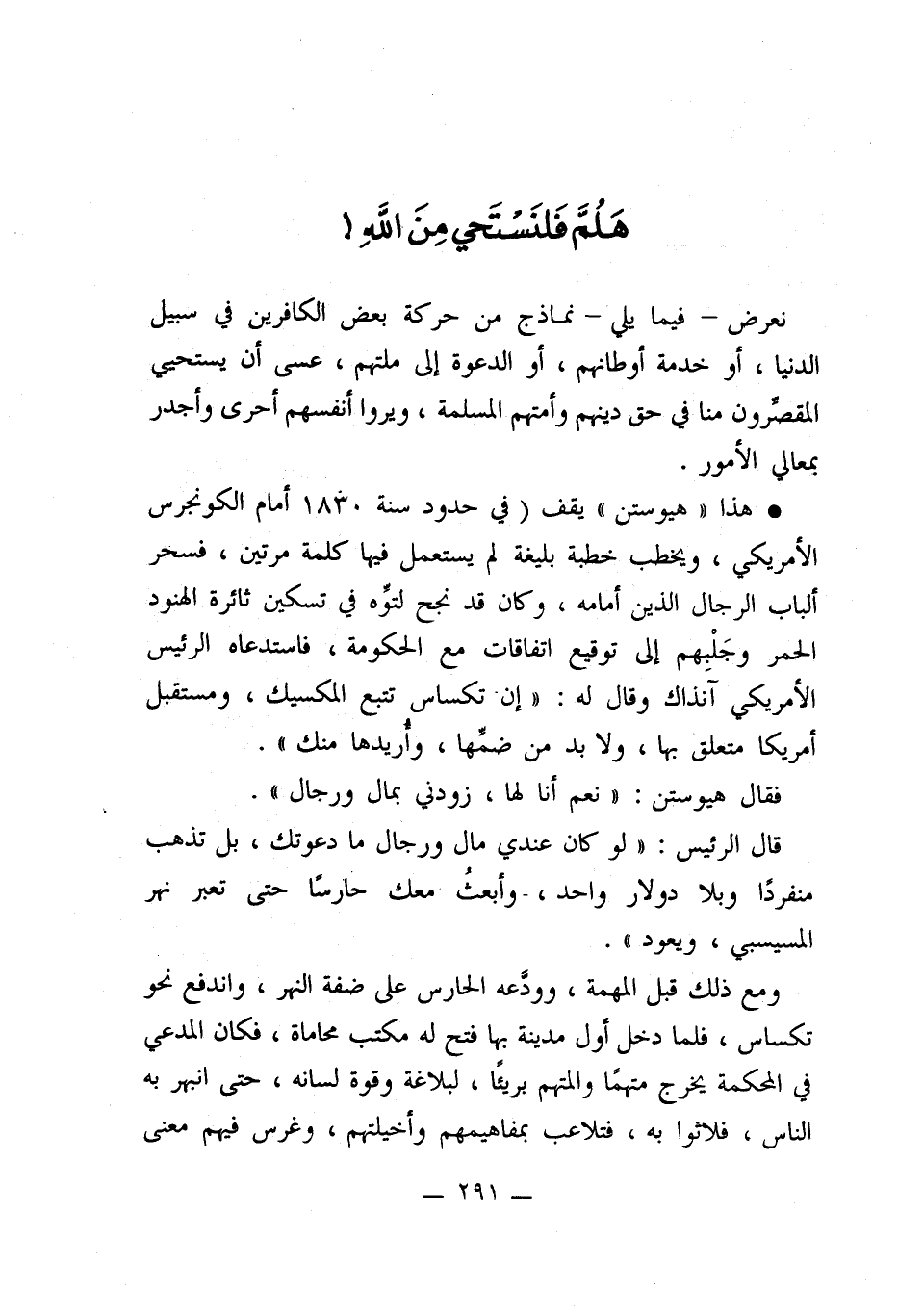 * هذا "هيوستن" يقف (في حدود سنة 1830 أمام الكونجرس الأمريكي، ويخطب خطبة بليغة لم يستعمل فيها كلمة مرتين، فسحر ألباب الرجال الذين أمامه، وكان قد نجح لتوِّه في تسكين ثائرة الهنود الحمر وجَلْبِهم إلى توقيع اتفاقات مع الحكومة، فاستدعاه الرئيس الأمريكي آنذاك وقال له: "إن تكساس تتبع المكسيك، ومستقبل أمريكا متعلق بها، ولا بد من ضمِّها، وأريدها منك".