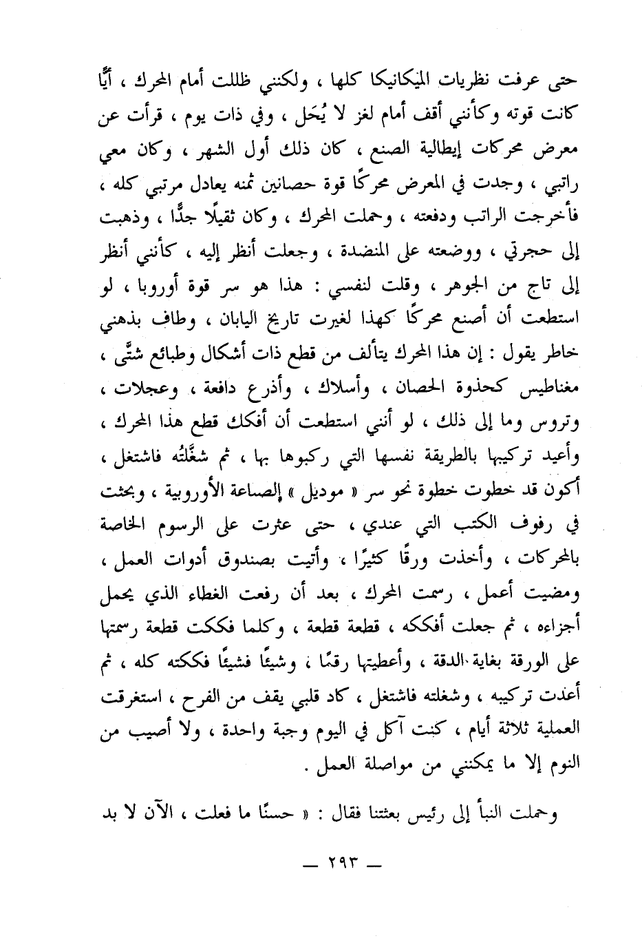 حتى عرفت نظريات الميكانيكا كلها، ولكنني ظللت أمام المحرك، أيًّا كانت قوته وكأنني أقف أمام لغز لا يُحَل، وفي ذات يوم، قرأت عن معرض محركات إيطالية الصنع، كان ذلك أول الشهر، وكان معي راتبي، وجدت في المعرض محركًا قوة حصانين ثمنه يعادل مرتبي كله، فأخرجت الراتب ودفعته، وحملت المحرك، وكان ثقيلًا جدًّا، وذهبت إلى حجرتي، ووضعته على المنضدة، وجعلت أنظر إليه، كأنني أنظر إلى تاج من الجوهر، وقلت لنفسي: هذا هو سر قوة أوروبا، لو استطعت أن أصنع محركًا كهذا لغيرت تاريخ اليابان، وطاف بذهني خاطر يقول: إن هذا المحرك يتألف من قطع ذات أشكال وطبائع شتَّى، مغناطيس كحذوة الحصان، وأسلاك، وأذرع دافعة، وعجلات، وتروس وما إلى ذلك، لو أنني استطعت أن أفكك قطع هذا المحرك، وأعيد تركيبها بالطريقة نفسها التي ركبوها بها، ثم شغَّلتُه فاشتغل، أكون قد خطوت خطوة نحو سر "موديل" الصناعة الأوروبية، وبحثت في رفوف الكتب التي عندي، حتى عثرت على الرسوم الخاصة بالمحركات، وأخذت ورقًا كثيرًا، وأتيت بصندوق أدوات العمل، ومضيت أعمل، رسمت المحرك، بعد أن رفعت الغطاء الذي يحمل أجزاءه، ثم جعلت أفككه، قطعة قطعة، وكلما فككت قطعة رسمتها على الورقة بغاية الدقة، وأعطيتها رقمًا، وشيئًا فشيئًا فككته كله، ثم أعدت تركيبه، وشغلته فاشتغل، كان قلبي يقف من الفرح، استغرقت العملية ثلاثة أيام، كنت آكل في اليوم وجبة واحدة، ولا أصيب من النوم إلا ما يمكنني من مواصلة العمل.
