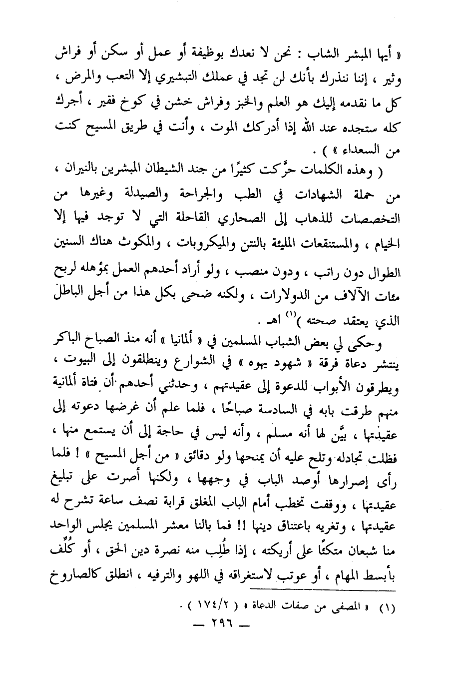 (وهذه الكلمات حرَّكت كثيرًا من جند الشيطان المبشرين بالنيران، من حملة الشهادات في الطب والجراحة والصيدلة وغيرها من التخصصات للذهاب إلى الصحاري القاحلة التي لا توجد فيها إلا الخيام، والمستنقعات المليئة بالنتن والميكروبات، والمكوث هناك السنين الطوال دون راتب، ودون منصب، ولو أراد أحدهم العمل بمؤهله لربح مئات الآلاف من الدولارات، ولكنه ضحى بكل هذا من أجل الباطل الذي يعتقد صحته) (¬1) اهـ.