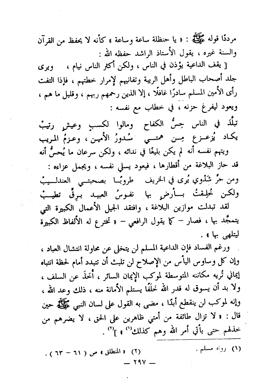 ورغم الفساد فإن الداعية المسلم لن يتخلى عن محاولة انتشال العباد، وإن كل وساوس اليأس من الإصلاح لن تلبث أن تتبدد أمام لحظة انتباه إيماني تُريه مكانته المتوسطة لموكب الإيمان السائر، أخذَ عن السلف، ولا بد أن يسوق له قدر الله خَلَفًا يستلم الأمانة منه، ذلك وعد الله، وإنه لموكب لن ينقطع أبدًا، مضى به القول على لسان النبي - صلى الله عليه وسلم - حين قال: "لا تزال طائفة من أمتي ظاهرين على الحق، لا يضرهم من خذلهم حتى يأتي أمر الله وهم كذلك (¬1) "] (¬2).