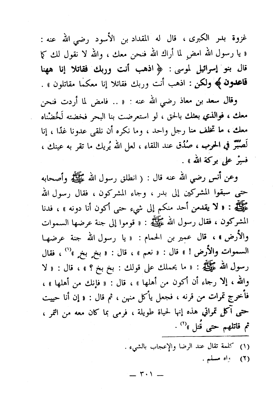 وعن أنس رضي الله عنه قال: (انطلق رسول الله - صلى الله عليه وسلم - وأصحابه حتى سبقوا المشركِين إلى بدر، وجاء المشركون، فقال رسول الله - صلى الله عليه وسلم-: "لا يقدمن أحد منكم إلى شيء حتى أكون أنا دونه"، فدنا المشركون، فقال رسول الله - صلى الله عليه وسلم-: "قوموا إلى جنة عرضها السماوات والأرض"، قال عمير بن الحمام: "يا رسول الله جنة عرضها السماوات والأرض" قال: "نعم"، قال: "بخ بخ" (¬1)، فقال رسوله الله - صلى الله عليه وسلم-: "ما يحملك على قولك: بخ بخ؟ "، قال: "لا والله، إلا رجاء أن أكون من أهلها"، قال: "فإنك من أهلها"، فأخرج تمرات من قرنه، فجعل يأكل منهن، ثم قال: "إن أنا حييت حتى آكل تمراتي هذه إنها لحياة طويلة، فرمى بما كان معه من التمر، ثم قاتلهم حتى قُتل" (¬2).