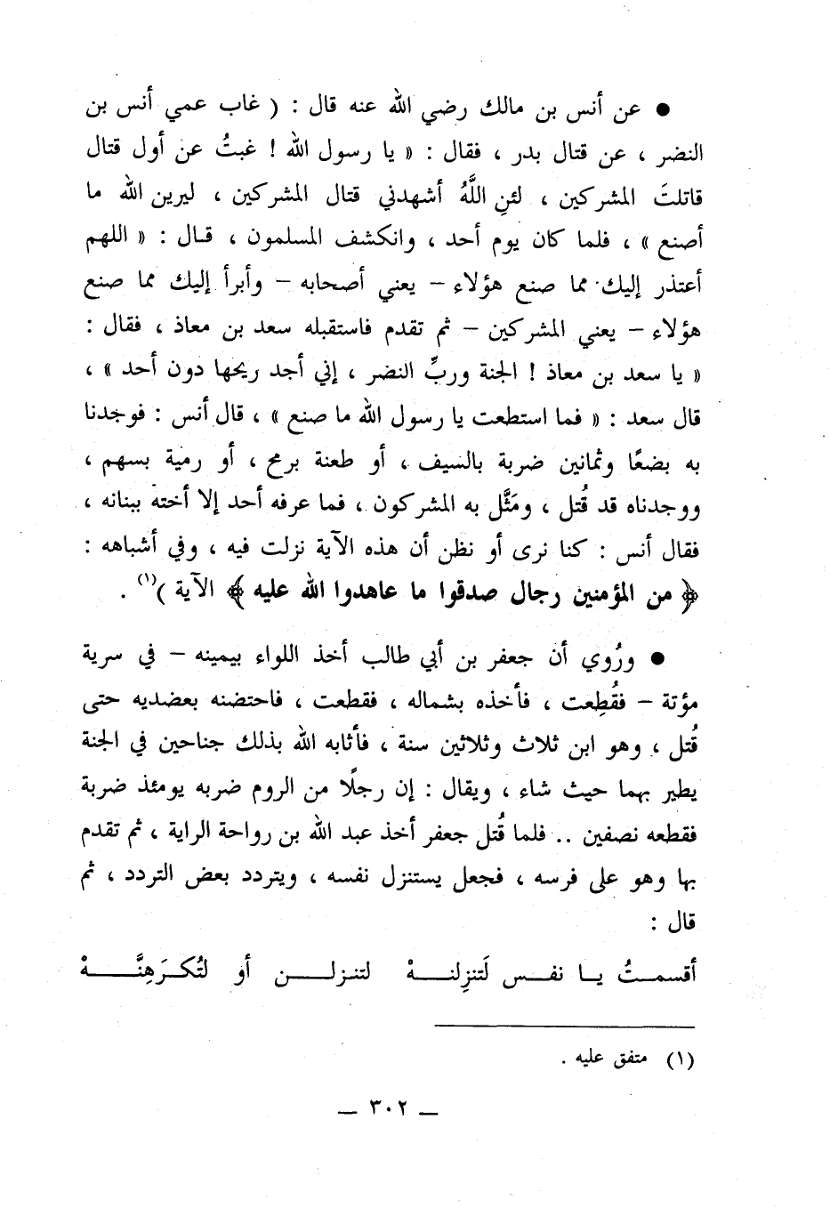 * عن أنس بن مالك رضي الله عنه قال: (غاب عمي أنس بن النضر، عن قتال بدر، فقال: "يا رسول الله! غبتُ عن أول قتال قاتلتَ المشركين، لئنِ اللهُ أشهدني قتال المشركين، ليرين الله ما أصنع"، فلما كان يوم أحد، وانكشف المسلمون، قال: "اللهم أعتذر إليك مما صنع هؤلاء -يعني أصحابه- وأبرأ إليك مما صنع هؤلاء -يعني المشركين- ثم تقدم فاستقبله سعد بن معاذ، فقال: "يا سعد بن معاذ! الجنة وربِّ النضر، إني أجد ريحها دون أحد"، قال سعد: "فما استطعت يا رسول الله ما صنع"، قال أنس: فوجدنا به بضعًا وثمانين ضربة بالسيف، أو طعنة برمح، أو رمية بسهم، ووجدناه قد قُتل، ومَثَّل به المشركون، فما عرفه أحد إلا أخته ببنانه، فقال أنس: كنا نرى أو نظن أن هذه الآية نزلت فيه، وفي أشباهه: {من المؤمنين رجال صدقوا ما عاهدوا الله عليه} الآية) (¬1).