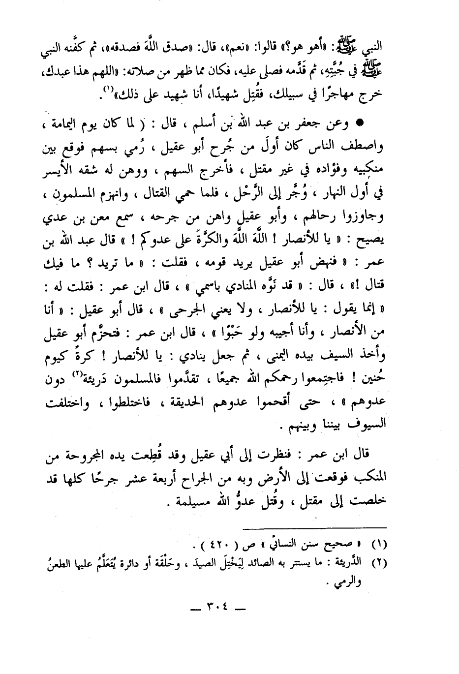 * وعن جعفر بن عبد الله بن أسلم، قال: (لما كان يوم اليمامة، واصطف الناس كان أولَ من جُرح أبو عقيل، رُمي بسهم فوقع بين منكبيه وفؤاده في غير مقتل، فأخرج السهم، ووهن له شقه الأيسر في أول النهار، وُجرَّ إلى الرَّحْل، فلما حمي القتال، وانهزم المسلمون، وجاوزوا رحالهم، وأبو عقيل واهن من جرحه، سمع معن بن عدي يصيح: "يا للأنصار! اللهَ اللهَ والكرَّةَ على عدوكم! " قال عبد الله بن عمر: "فنهض أبو عقيل يريد قومه، فقلت: "ما تريد؟ ما فيك قتال! "، قال: "قد نَوَّه المنادى باسمي"، قال ابن عمر: فقلت له: "إنما يقول: يا للأنصار، ولا يعني الجرحى"، قال أبو عقيل: "أنا من الأنصار، وأنا أجيبه ولو حَبْوًا"، قال ابن عمر: فتحزَّم أبو عقيل وأخذ السيف بيده اليمنى، ثم جعل ينادي: يا للأنصار! كرةً كيوم حُنين! فاجتمِعوا رحمكم الله جميعًا، تقدَّموا فالمسلمون دَريئة (¬2) دون عدوهم"، حتى أقحموا عدوهم الحديقة، فاختلطوا، واختلفت السيوف بيننا وبينهم.
