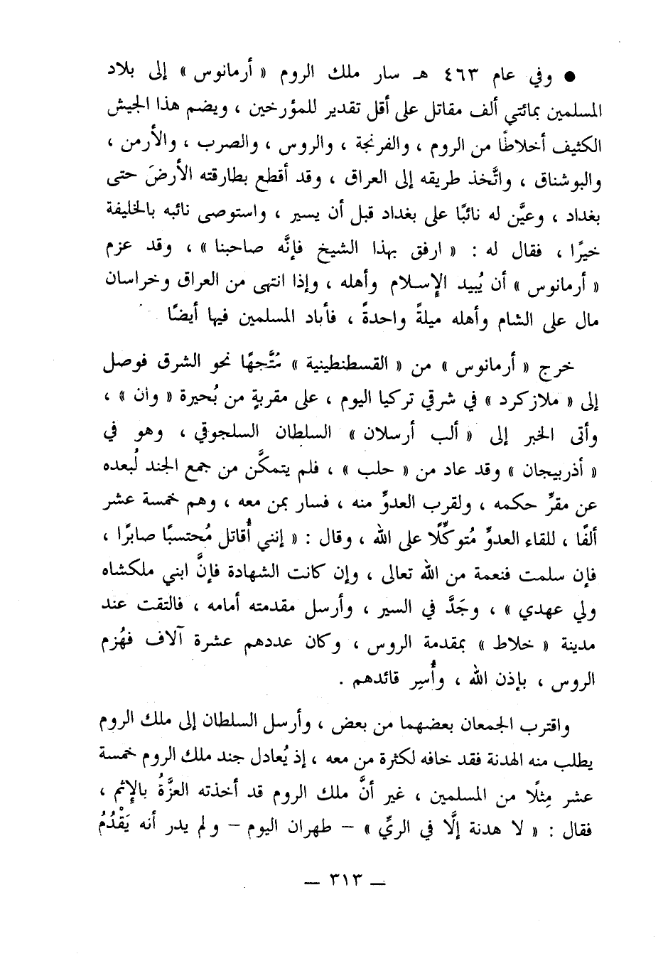 * وفي عام 463 هـ سار ملك الروم "أرمانوس" إلى بلاد المسلمين بمائتي ألف مقاتل على أقل تقدير للمؤرخين، ويضم هذا الجيش الكثيف أخلاطًا من الروم، والفرنجة، والروس، والصرب، والأرمن، والبوشناق، واتَّخذ طريقه إلى العراق، وقد أقطع بطارقته الأرضَ حتى بغداد، وعيَّن له نائبًا على بغداد قبل أن يسير، واستوصى نائبه بالخليفة خيرًا، فقال له: "ارفق بهذا الشيخ فإنَّه صاحبنا"، وقد عزم "أرمانوس" أن يُبيد الإسلام وأهله، وإذا انتهى من العراق وخراسان مال على الشام وأهله ميلةً واحدةً، فأباد المسلمين فيها أيضًا.