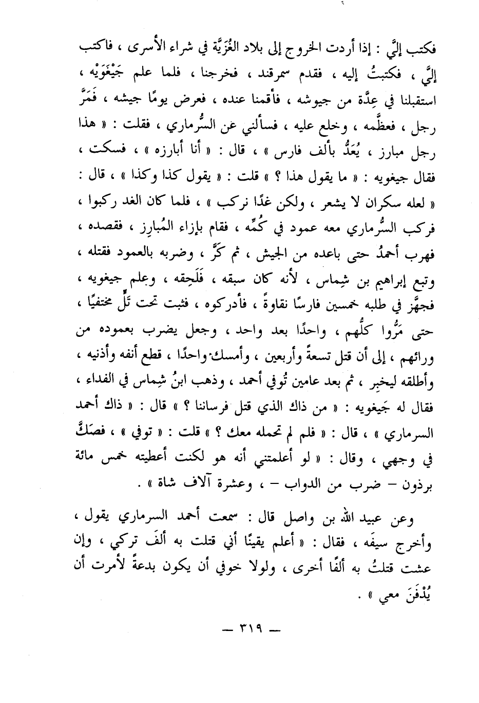 فكتب إليَّ: إذا أردت الخروج إلى بلاد الغُزَيَّة في شراء الأسرى، فاكتب إليَّ، فكتبتُ إليه، فقدم سمرقند، فخرجنا، فلما علم جَيْغَوَيْه، استقبلنا في عِدَّة من جيوشه، فأقمنا عنده، فعرض يومًا جيشه، فَمَرَّ رجل، فعظَّمه، وخلع عليه، فسألني عن السُّرماري، فقلت: "هذا رجل مبارز، يُعَدُّ بألف فارس"، قال: "أنا أبارزه"، فسكت، فقال جيغويه: "ما يقول هذا؟ " قلت: "يقول كذا وكذا"، قال: "لعله سكران لا يشعر، ولكن غدًا نركب"، فلما كان الغد ركبوا، فركب السُّرماري معه عمود في كُمِّه، فقام بإزاء المُبارِز، فقصده، فهرب أحمدُ حتى باعده من الجيش، ثم كَرَّ، وضربه بالعمود فقتله، وتبع إبراهيم بن شِماس، لأنه كان سبقه، فَلَحِقه، وعلم جيغويه، فجهَّز في طلبه خمسين فارسًا نقاوةً، فأدركوه، فثبت تحت تَلٍّ مختفيًا، حتى مَرُّوا كلّهم، واحدًا بعد واحد، وجعل يضرب بعموده من ورائهم، إلى أن قتل تسعةً وأربعين، وأمسك واحدًا، قطع أنفه وأذنيه، وأطلقه ليخبِر، ثم بعد عامين تُوفي أحمد، وذهب ابنُ شِماس في الفداء، فقال له جَيغويه: "من ذاك الذي قتل فرساننا؟ " قال: "ذاك أحمد السرماري"، قال: "فلم لم تحمله معك؟ " قلت: "توفي"، فصَكَّ في وجهي، وقال: "لو أعلمتني أنه هو لكنت أعطيته خمس مائة برذون -ضرب من الدواب-، وعشرة آلاف شاة".
