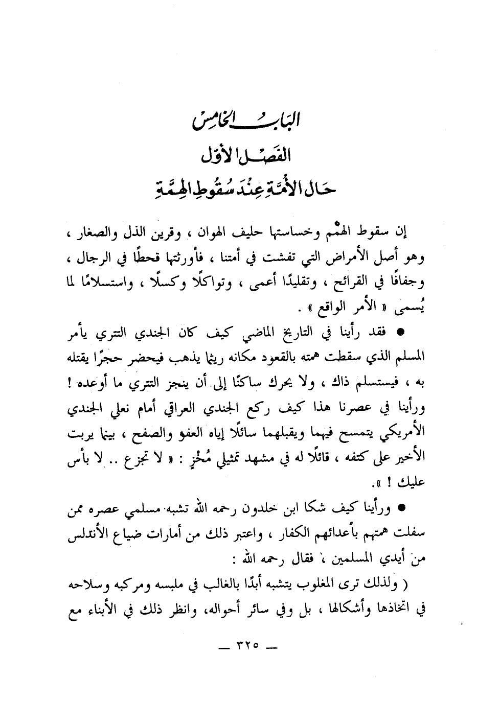 * فقد رأينا في التاريخ الماضي كيف كان الجندي التتَري يأمر المسلم الذي سقطت همته بالقعود مكانه ريثما يذهب فيحضر حجرًا يقتله به، فيستسلم ذاك، ولا يحرك ساكنًا إلى أن ينجز التتري ما أوعده! ورأينا في عصرنا هذا كيف ركع الجندي العراقي أمام نعلي الجندي الأمريكى يتمسح فيهما ويقبلهما سائلًا إياه العفو والصفح، بينما يربت الأخير على كتفه، قائلًا له في مشهد تمثيلي مُخْزٍ: "لا تجزع .. لا بأس عليك! ".