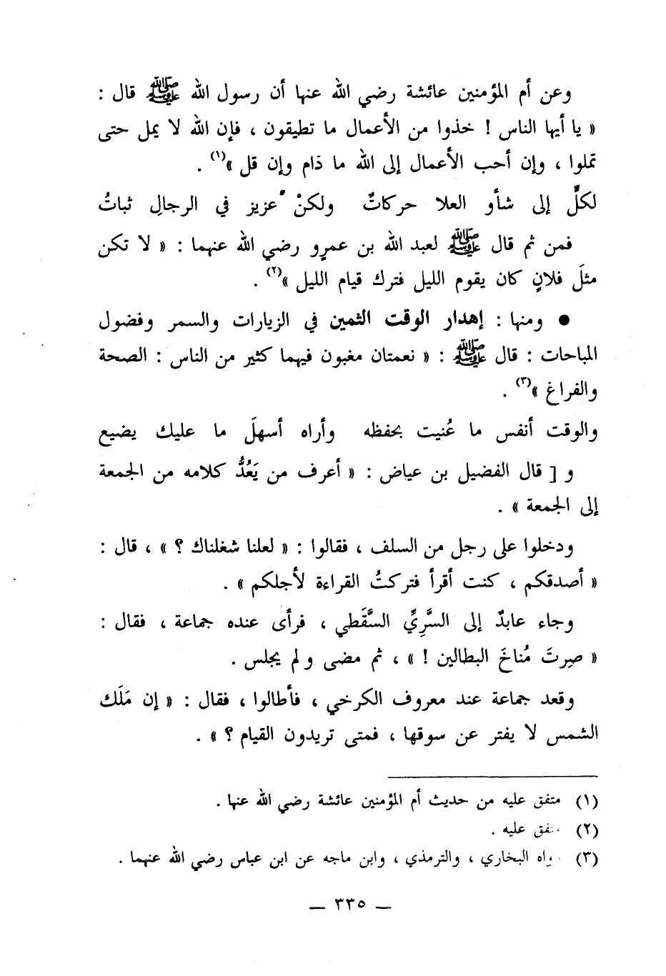 * ومنها: إهدار الوقت الثمين في الزيارات والسمر وفضول المباحات: قال - صلى الله عليه وسلم-: "نعمتان مغبون فيهما كثير من الناس: الصحة والفراغ" (¬3).