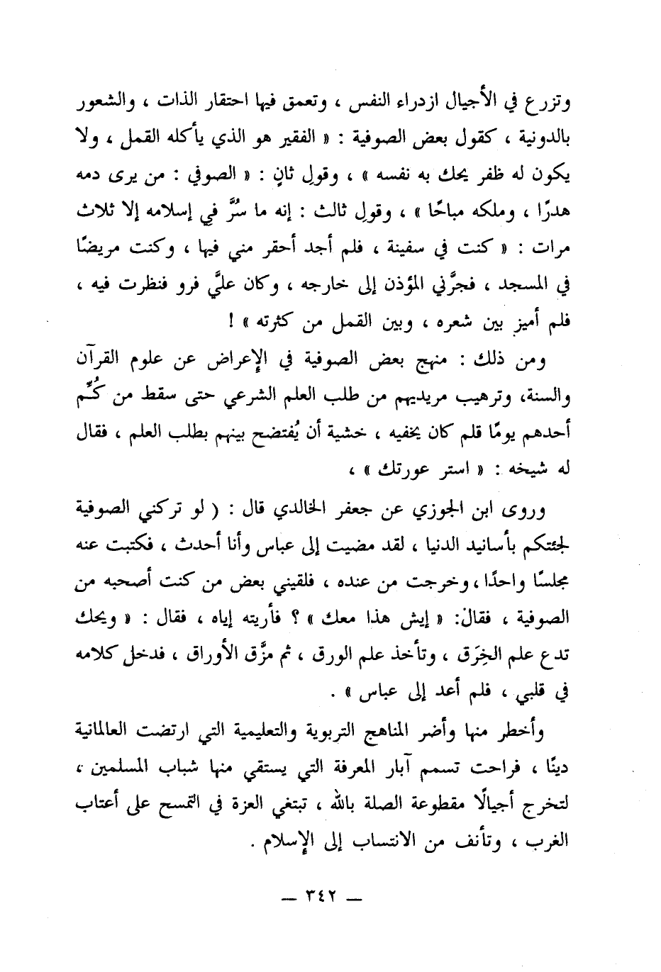 ومن ذلك: منهج بعض الصوفية في الإعراض عن علوم القرآن والسنة، وترهيب مريديهم من طلب العلم الشرعي حتى سقط من كُمِّ أحدهم يومًا قلم كان يخفيه، خشية أن يُفتضح بينهم بطلب العلم، فقال له شيخه: "استر عورتك"،