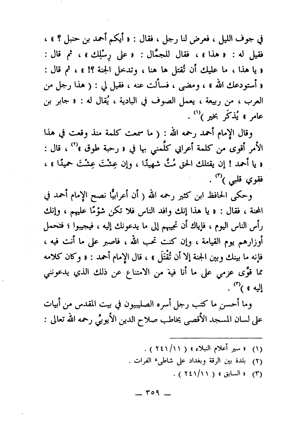 وحكى الحافظ ابن كثير رحمه الله (أن أعرابيًّا نصح الإمام أحمد في المحنة، فقال: (يا هذا إنك وافد الناس فلا تكن شؤمًا عليهم، وأنك رأس الناس اليوم، فإياك أن تجيبهم إلى ما يدعونك إليه، فيجيبوا؛ فتحمل أوزارهم يوم القيامة، وإن كنت تحب الله، فاصبر على ما أنت فيه، فإنه ما بينك وبين الجنة إلا أن تُقْتَلَ"، قال الإمام أحمد: "وكان كلامه مما قوَّى عزمي على ما أنا فيه من الامتناع عن ذلك الذي يدعونني إليه") (¬3).