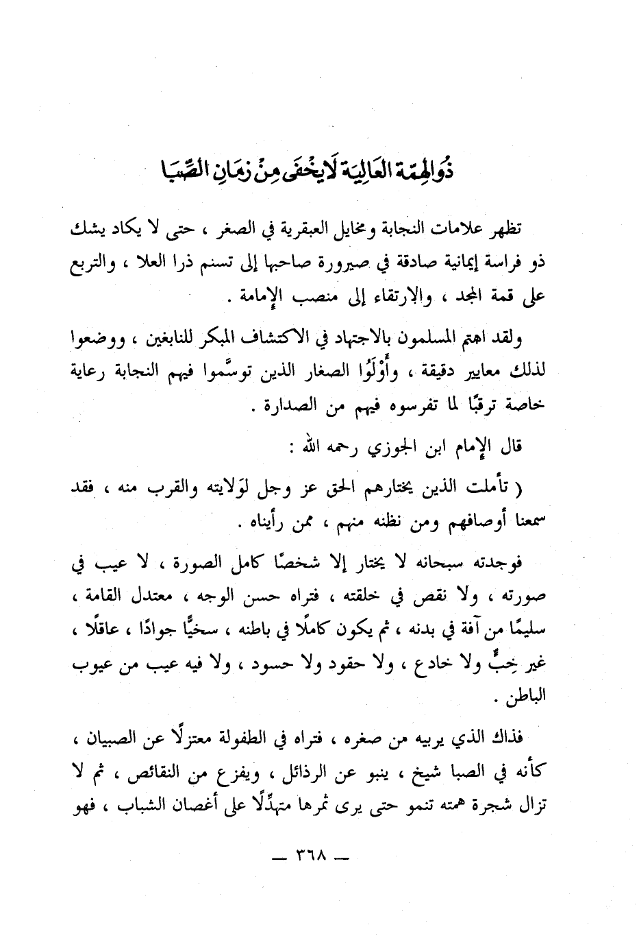 فذاك الذي يربيه من صغره، فتراه في الطفولة معتزلًا عن الصبيان، كأنه في الصبا شيخ، ينبو عن الرذائل، ويفزع من النقائص، ثم لا تزال شجرة همته تنمو حتى يرى ثمرها متهدِّلًا على أغصان الشباب، فهو