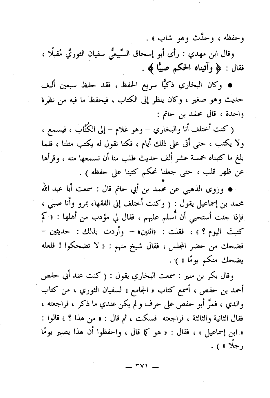 * وروى الذهبي عن محمد بن أبي حاتم قال: سمعت أبا عبد الله محمد بن إسماعيل يقول: (وكنت أختلف إلى الفقهاء بمرو وأنا صبي، فإذا جئت أستحيي أن أُسلم عليهم، فقال لي مؤدب من أهلها: "كم كتبتَ اليوم؟ "، فقلت: "اثنين" -وأردت بذلك: حديثين- فضحك من حضر المجلس، فقال شيخ منهم: "لا تضحكوا! فلعله يضحك منكم يومًا").