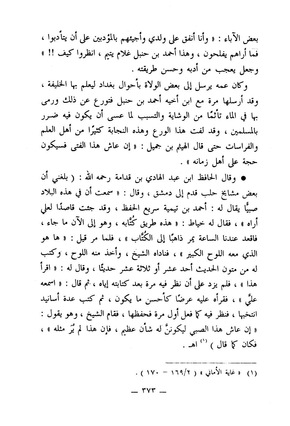 بعض الآباء: "وأنا أنفق على ولدي وأجيئهم بالمؤدبين على أن يتأدبوا، فما أراهم يفلحوق، وهذا أحمد بن حنبل غلام يتيم، انظروا كيف!! " وجعل يعجب من أدبه وحسن طريقته.