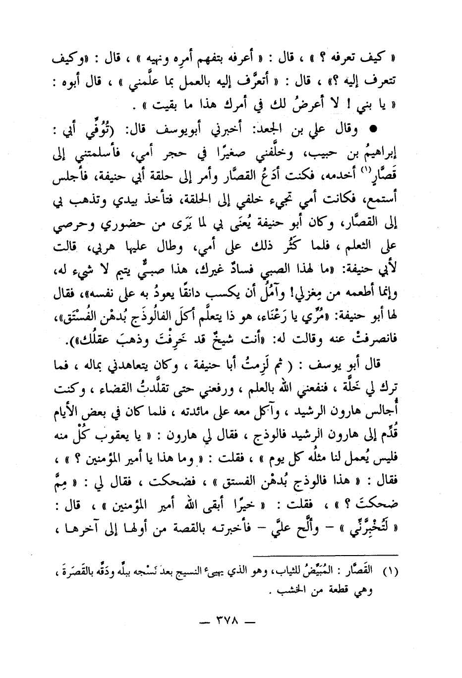 * وقال على بن الجعد: أخبرني أبو يوسف قال: (تُوُفِّي أبي: إبراهيمُ بن حبيب، وخلَّفني صغيرًا في حجر أمي، فأسلمتني إلى قَصَّارٍ (¬1) أخدمه، فكنت أدَعُ القصَّار وأمر إلى حلقة أبي حنيفة، فأجلس أستمع، فكانت أمي تجيء خلفي إلى الحلقة، فتأخذ بيدي وتذهب بي إلى القصَّار، وكان أبو حنيفة يُعنَى بي لما يَرَى من حضوري وحرصي على التعلم، فلما كثَرُ ذلك على أمي، وطال عليها هربي، قالت لأبي حنيفة: "ما لهذا الصبي فساد غيرك، هذا صبيٌّ يتيم لا شيء له، وإنما أطعمه من مِغزلي! وآمُلُ أن يكسب دانقًا يعودُ به على نفسه"، فقال لها أبو حنيفة: "مُرِّى يا رَعْنَاء، هو ذا يتعلَّم أكلَ الفالُوذَج بُدهْن الفُسْتَق"، فانصرفت عنه وقالت له: "أنت شيخٌ قد خَرِفْتَ وذهبَ عقلُك").