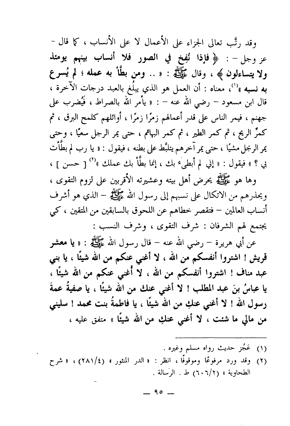 وقد رتَّب تعالى الجزاء على الأعمال لا على الأنساب، كما قال -عز وجل-: {فإذا نفِخ في الصور فلا أنساب بينهم يومئذ ولا يتساءلون}، وقال - صلى الله عليه وسلم -:" .. ومن بطَّأ به عمله؛ لم يُسرع به نسبه" (¬1)، معناه: أن العمل هو الذي يبلُغ بالعبد درجات الآخرة، قال ابن مسعود -رضي الله عنه-: "يأمر الله بالصراط، فَيُضرب على جهنم، فيمر الناس على قدر أعمالهم زمرًا زمرًا، أوائلهم كلمح البرق، ثم كمرِّ الريح، ثم كمر الطير، ثم كمر البهائم، حتى يمر الرجل سعيًا، وحتى يمر الرجل مشيًا، حتى يمرآخرهم يتلبَّط على بطنه، فيقول: "يا رب لم بطَّأت بي؟ " فيقول: "إني لم أبطىء بك، إنما بطَّأ بك عملك" (¬2) [حسن]، وها هو - صلى الله عليه وسلم - يحرض أهل بيته وعشيرته الأقربين على لزوم التقوى، ويحذرهم من الاتكال على نسبهم إلى رسول الله - صلى الله عليه وسلم - الذي هو أشرف أنساب العالمين- فتقصر خطاهم عن اللحوق بالسابقين من المتقين، كي يجتمع لهم الشرفان: شرف التقوى، وشرف النسب: