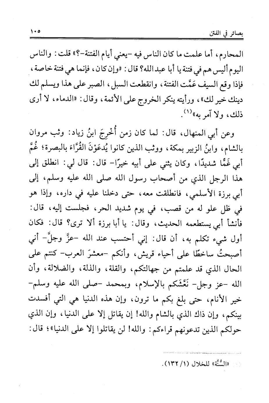 وعن أبي المنهال، قال: لما كان زمن أُخْرِجَ ابنُ زياد: وثب مروان بالشام، وابنُ الزبير بمكة، ووثب الذين كانوا يُدعَوْنَ القُرَّاءَ بالبصرة؛ غُمَّ أبي غَمُّا شديدًا، وكان يثني على أبيه خيرًا- قال: قال لي: انطلق إلى هذا الرجل الذي من أصحاب رسول الله صلى الله عليه وسلم، إلى أبي برزة الأسلمي، فانطلقت معه، حتى دخلنا عليه في داره، وإذا هو في ظل علو له من قصب، في يوم شديد الحر، فجلست إليه، قال: فأنشأ أبي يستطعمه الحديث، وقال: يا أبا برزة ألا ترى؟ قال: فكان أول شيء تكلم به، أن قال: إني أحتسب عند الله -عزَّ وجلَّ- أني أصبحتُ ساخطًا على أحياء قريش، وأنكم -معشرَ العرب- كنتم على الحال الذي قد علمتم من جهالتكم، والقلة، والذلة، والضلالة، وأن الله -عز وجل- نَعَّشَكم بالإِسلام، وبمحمد- صلى الله عليه وسلم - خير الأنام، حتى بلغ بكم ما ترون، وإن هذه الدنيا هي التي أفسدت بينكم، وإن ذاك الذي بالشام والله! إن يقاتل إلا على الدنيا، وإن الذي حولكم الذين تدعونهم قراءكم: والله! لن يقاتلوا إلا على الدنيا"؛ قال: