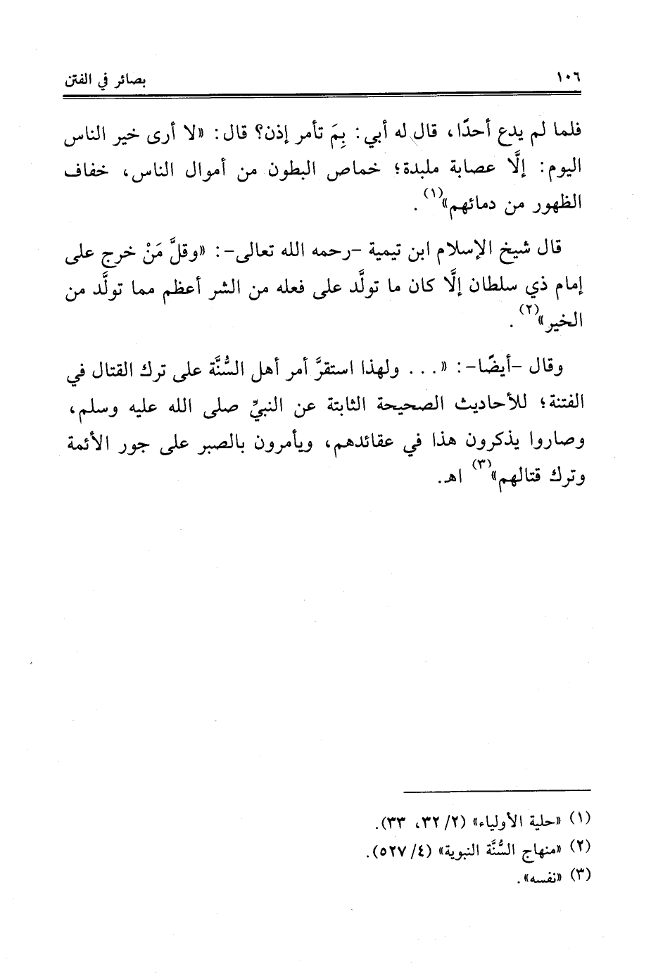 وقال -أيضًا-: " ... ولهذا استقرَّ أمر أهل السُّنَّة على ترك القتال في الفتنة؛ للأحاديث الصحيحة الثابتة عن النبيِّ صلى الله عليه وسلم، وصاروا يذكرون هذا في عقائدهم، ويأمرون بالصبر على جور الأئمة وترك قتالهم" (¬3) اهـ.