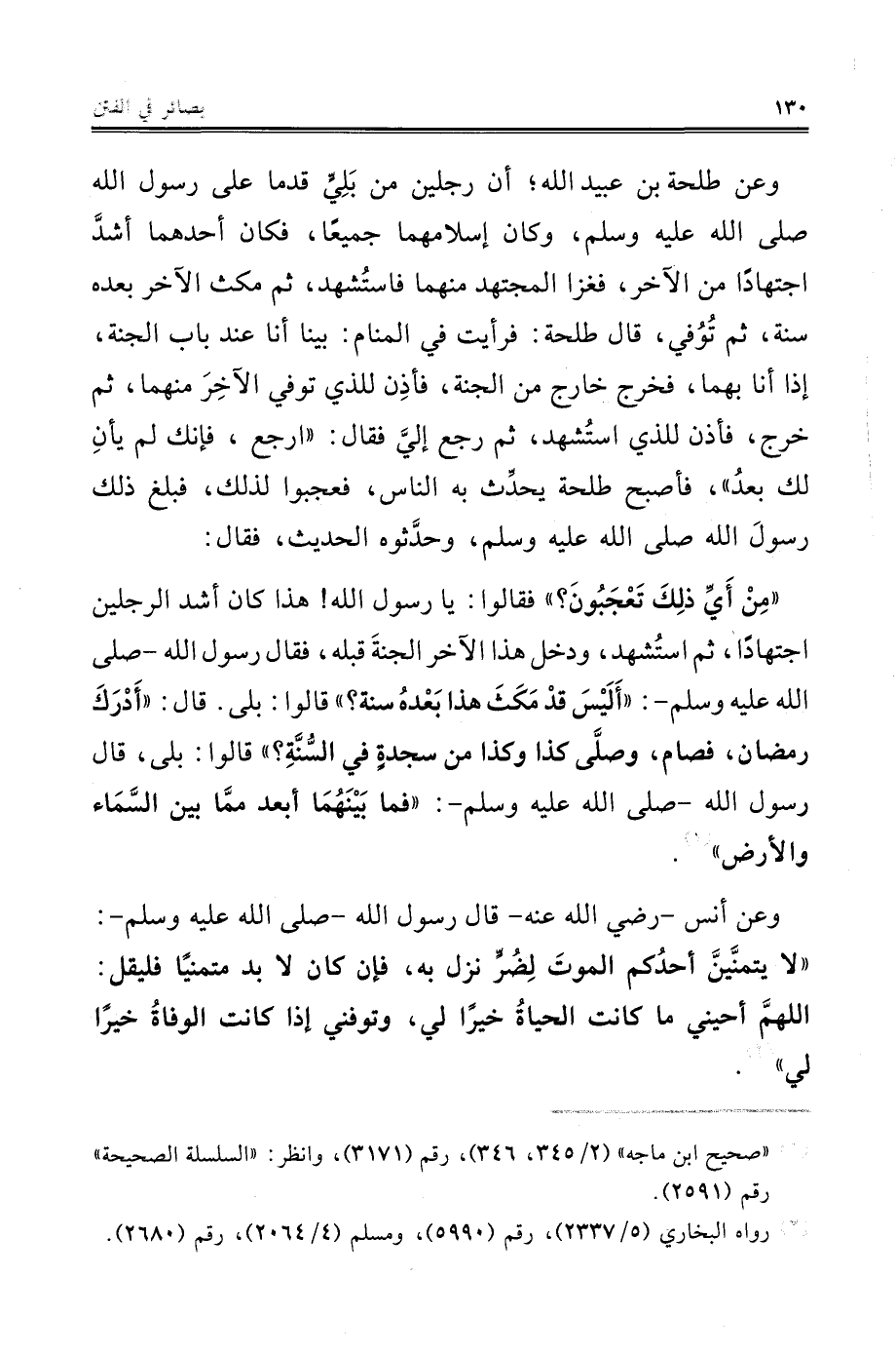 وعن طلحة بن عبيد الله؛ أن رجلين من بَلِيٍّ قدما على رسول الله صلى الله عليه وسلم، وكان إسلامهما جميعًا، فكان أحدهما أشدَّ اجتهادًا من الآخر، فغزا المجتهد منهما فاستُشهد، ثم مكث الآخر بعده سنة، ثم تُوُفي، قال طلحة: فرأيت في المنام: بينا أنا عند باب الجنة، إذا أنا بهما، فخرج خارج من الجنة، فأذِن للذي توفي الآخِرَ منهما، ثم خرج، فأذن للذي استُشهد، ثم رجع إليَّ فقال: "ارجع، فإنك لم يأنِ لك بعدُ"، فأصبح طلحة يحدّث به الناس، فعجبوا لذلك، فبلغ ذلك رسولَ الله صلى الله عليه وسلم، وحدَّثوه الحديث، فقال:
