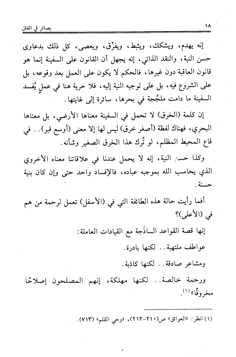 إنه يهدم، ويشكك، ويثبط، ويفرِّق، ويعصى، كل ذلك بدعاوى حسن النية، والنقد الذاتي، إنه يجهل أن القانون على السفينة إنما هو قانون العاقبة دون غيرها، فالحكم لا يكون على العمل بعد وقوعه، بل على الشروع فيه، بل على توجيه النية إليه، فلا حرية هنا في عملٍ يُفسد السفينة ما دامت ملجَّجة في بحرها، سائرة إلى غايتها.