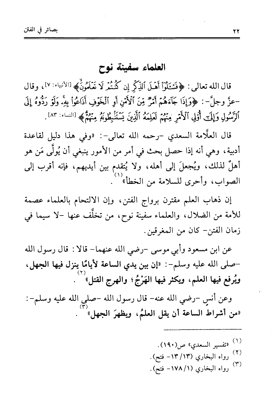 إن ذهاب العلم مقترن برواج الفتن، وإن الالتحام بالعلماء عصمة للأمة من الضلال، والعلماء سفينة نوح، من تخلَّف عنها -لا سيما في زمان الفتن- كان من المغرقين.