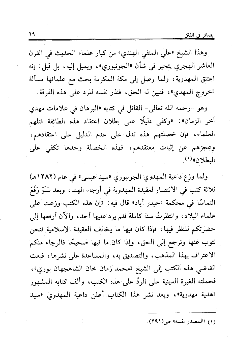 وهذا الشيخ "علي المتقي الهندي" من كبار علماء الحديث في القرن العاشر الهجري يتحير في شأن "الجونبوري"، ويميل إليه، بل قيل: إنه اعتنق المهدوية، ولما وصل إلى مكة المكرمة بحث مع علمائها مسألة "خروج المهدي"، فتبين له الحق، فنذر نفسه للرد على هذه الفرقة.