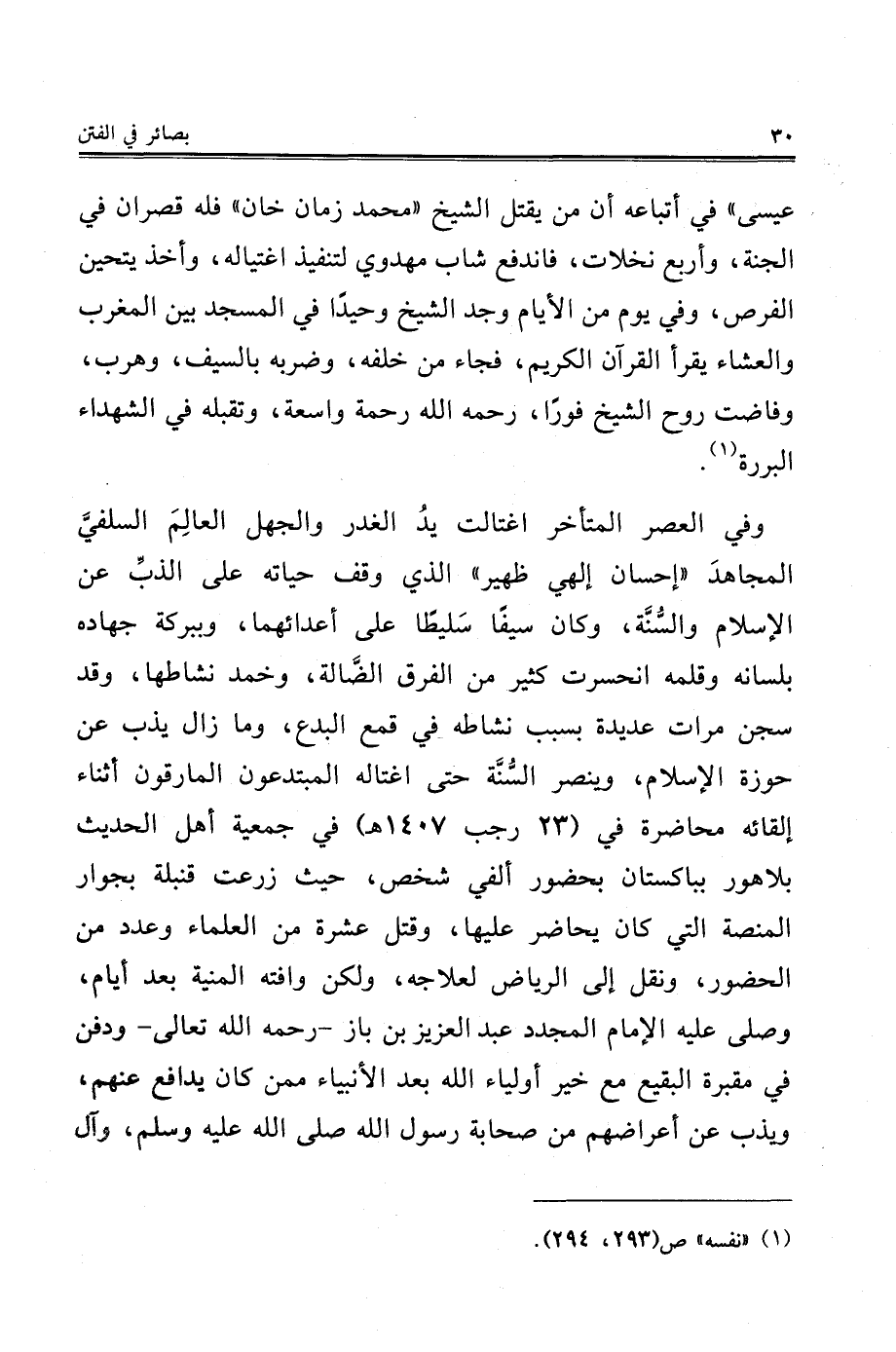 وفي العصر المتأخر اغتالت يدُ الغدر والجهل العالِمَ السلفيَّ المجاهدَ "إحسان إلهي ظهير" الذي وقف حياته على الذبِّ عن الإِسلام والسُّنَّة، وكان سيفًا سَليطًا على أعدائهما، وببركة جهاده بلسانه وقلمه انحسرت كثير من الفرق الضَّالة، وخمد نشاطها، وقد سجن مرات عديدة بسبب نشاطه في قمع البدع، وما زال يذب عن حوزة الإِسلام، وينصر السّنَّة حتى اغتاله المبتدعون المارقون أثناء إلقائه محاضرة في (23 رجب 1407 هـ) في جمعية أهل الحديث بلاهور بباكستان بحضور ألفي شخص، حيث زرعت قنبلة بجوار المنصة التي كان يحاضر عليها، وقتل عشرة من العلماء وعدد من الحضور، ونقل إلى الرياض لعلاجه، ولكن وافته المنية بعد أيام، وصلى عليه الإِمام المجدد عبد العزيز بن باز - رحمه الله تعالى- ودفن في مقبرة البقيع مع خير أولياء الله بعد الأنبياء ممن كان يدافع عنهم، ويذب عن أعراضهم من صحابة رسول الله صلى الله عليه وسلم، وآل
