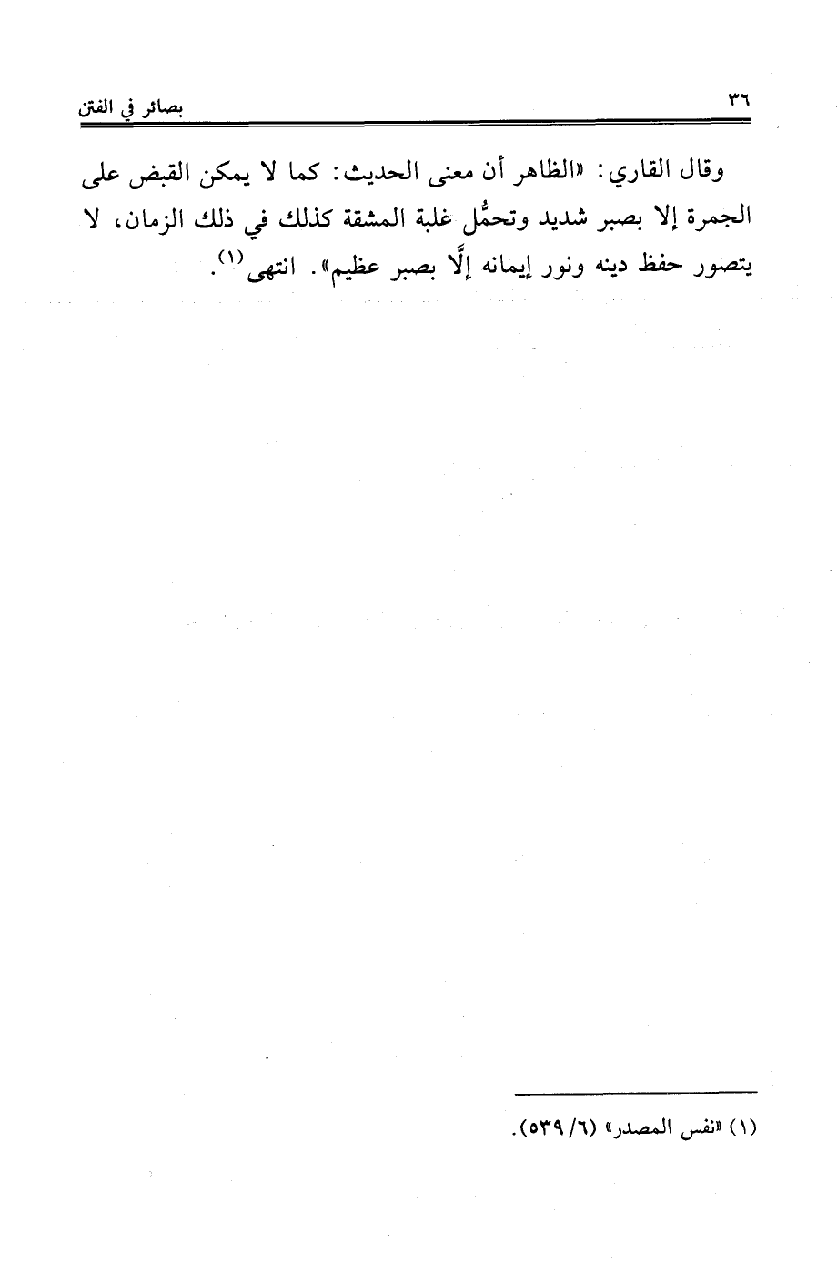 وقال القاري: "الظاهر أن معنى الحديث: كما لا يمكن القبض على الجمرة إلا بصبر شديد وتحمُّل غلبة المشقة كذلك في ذلك الزمان، لا يتصور حفظ دينه ونور إيمانه إلاَّ بصبر عظيم". انتهى (¬1).