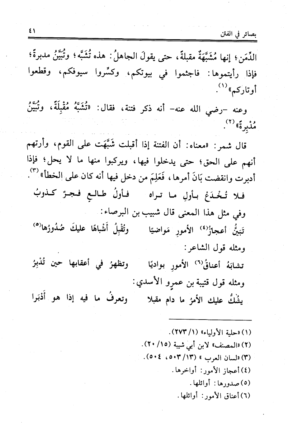 قال شمر: "معناه: أن الفتنة إذا أقبلت شَبَّهَت على القوم، وأرتهم أنهم على الحق؛ حتى يدخلوا فيها، ويركبوا منها ما لا يحل؛ فإذا أدبرت وانقضت بَانَ أمرها، فَعَلِمَ من دخل فيها أنه كان على الخطأ" (¬3).
