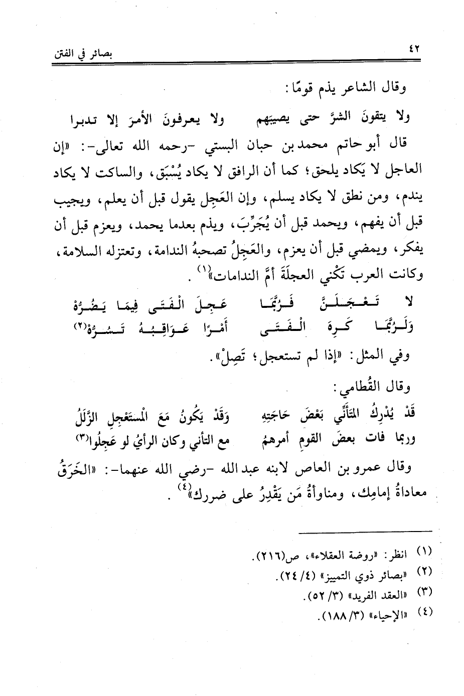 قال أبو حاتم محمَّد بن حبان البستي -رحمه الله تعالى-: "إن العاجل لا يَكاد يلحق؛ كما أن الرافق لا يكاد يُسْبَق، والساكت لا يكاد يندم، ومن نطق لا يكاد يسلم، وإن العَجِل يقول قبل أن يعلم، ويجيب قبل أن يفهم، ويحمد قبل أن يُجَرِّبَ، ويذم بعد ما يحمد، ويعزم قبل أن يفكر، ويمضي قبل أن يعزم، والعَجِلُ تصحبهُ الندامة، وتعتزله السلامة، وكانت العرب تَكْني العجلَةَ أمَّ الندامات" (¬1).