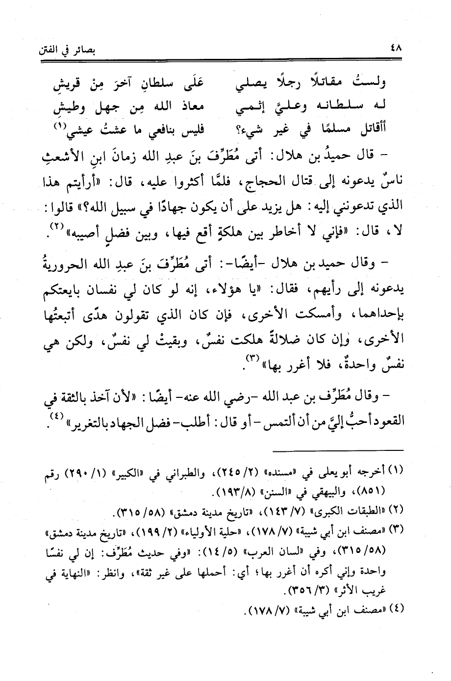 - وقال حميد بن هلال -أيضًا-: أتى مُطَرفَ بنَ عبدِ الله الحروريةُ يدعونه إلى رأيهم، فقال: "يا هؤلاء، إنه لو كان لي نفسان بايعتكم بإحداهما، وأمسكت الأخرى، فإن كان الذي تقولون هدًى أتبعتُها الأخرى، وأن كان ضلالةً هلكت نفسٌ، وبقيتْ لي نفسٌ، ولكن هي نفسٌ واحدةٌ، فلا أغرر بها" (¬3).