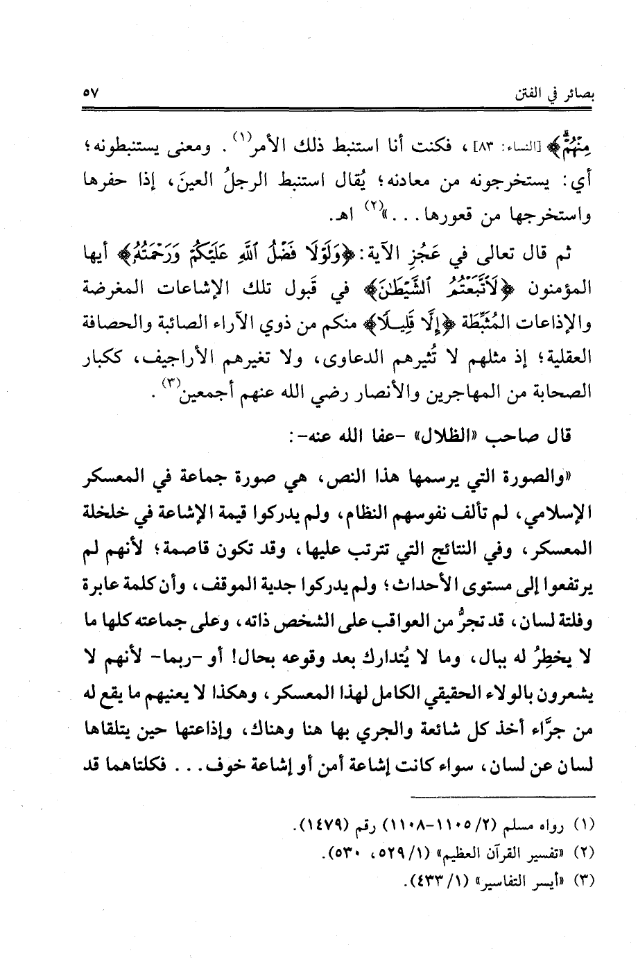 "والصورة التي يرسمها هذا النص، هي صورة جماعة في المعسكر الإِسلامي، لم تألف نفوسهم النظام، ولم يدركوا قيمة الإشاعة في خلخلة المعسكر، وفي النتائج التي تترتب عليها، وقد تكون قاصمة؛ لأنهم لم يرتفعوا إلى مستوى الأحداث؛ ولم يدركوا جدية الموقف، وأن كلمة عابرة وفلتة لسان، قد تجرُّ من العواقب على الشخص ذاته، وعلى جماعته كلها ما لا يخطِرُ له ببال، وما لا يُتدارك بعد وقوعه بحال! أو -ربما- لأنهم لا يشعرون بالولاء الحقيقي الكامل لهذا المعسكر، وهكذا لا يعنيهم ما يقع له من جرَّاء أخذ كل شائعة والجري بها هنا وهناك، وإذاعتها حين يتلقاها لسان عن لسان، سواء كانت إشاعة أمن أو إشاعة خوف ... فكلتاهما قد