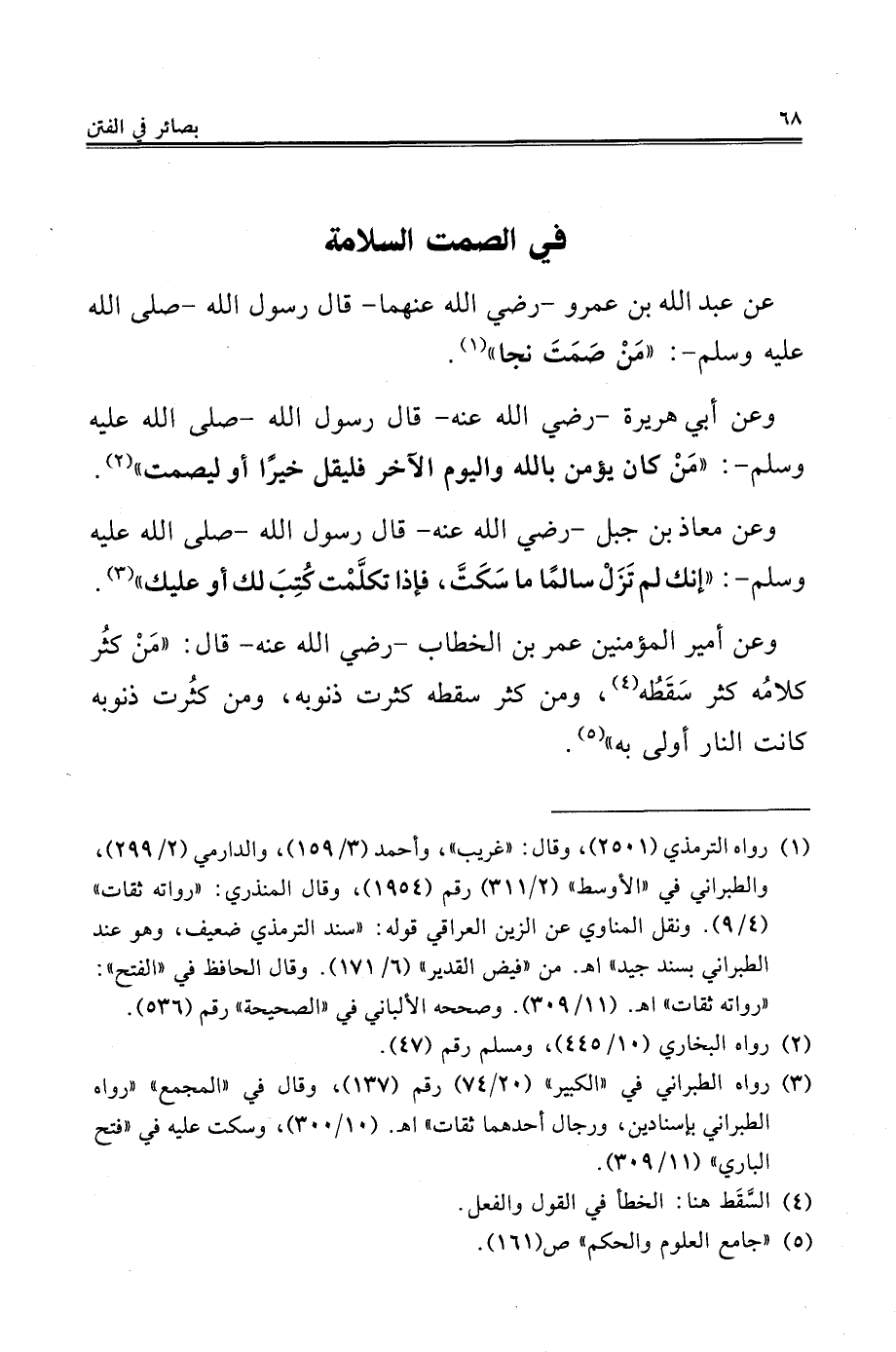 عن عبد الله بن عمرو - رضي الله عنهما- قال رسول الله - صلى الله عليه وسلم -: "مَنْ صَمَتَ نجا" (¬1).