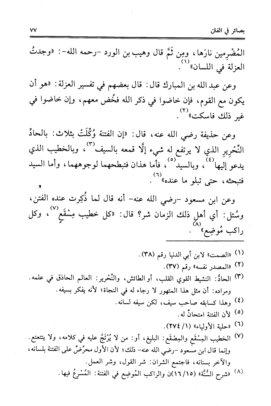 المُضْرِمين نارَها، ومِن ثَمَّ قال وهيب بن الورد - رحمه الله -: "وجدتُ العزلة في اللسان" (¬1).