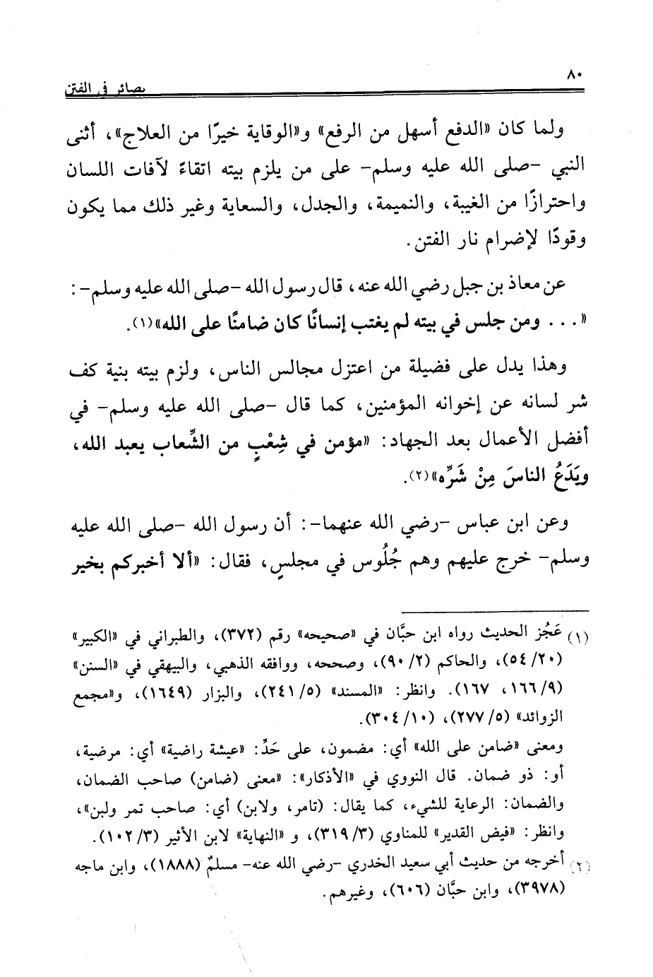 ولما كان "الدفع أسهل من الرفع" و"الوقاية خيرًا من العلاج"، أثنى النبي - صلى الله عليه وسلم - على من يلزم بيته اتقاءً لآفات اللسان واحترازًا من الغيبة، والنميمة، والجدل، والسعاية وغير ذلك مما يكون وقودًا لإضرام نار الفتن.