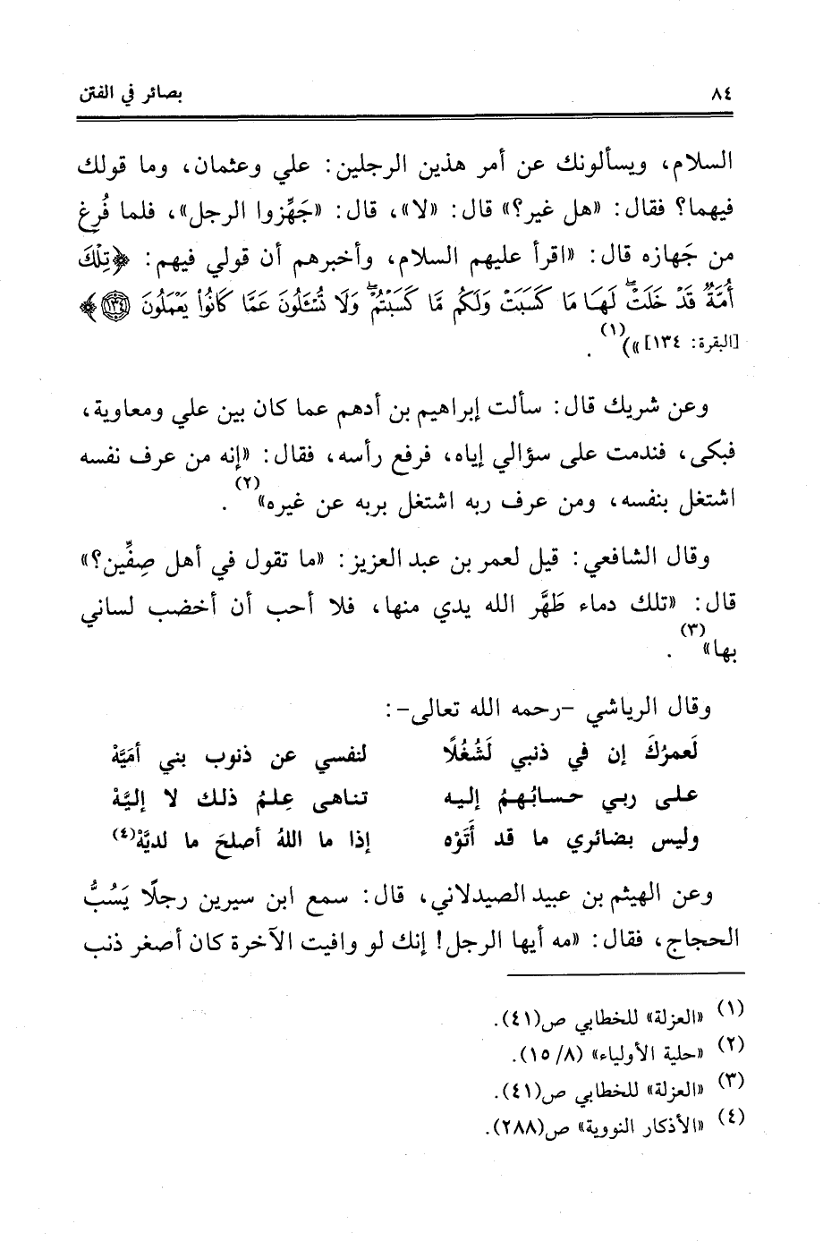 وقال الشافعي: قيل لعمر بن عبد العزيز: "ما تقول في أهل صِفِّين؟ " قال: "تلك دماء طَهَّر الله يدي منها، فلا أحب أن أخضب لساني بها" (¬3).