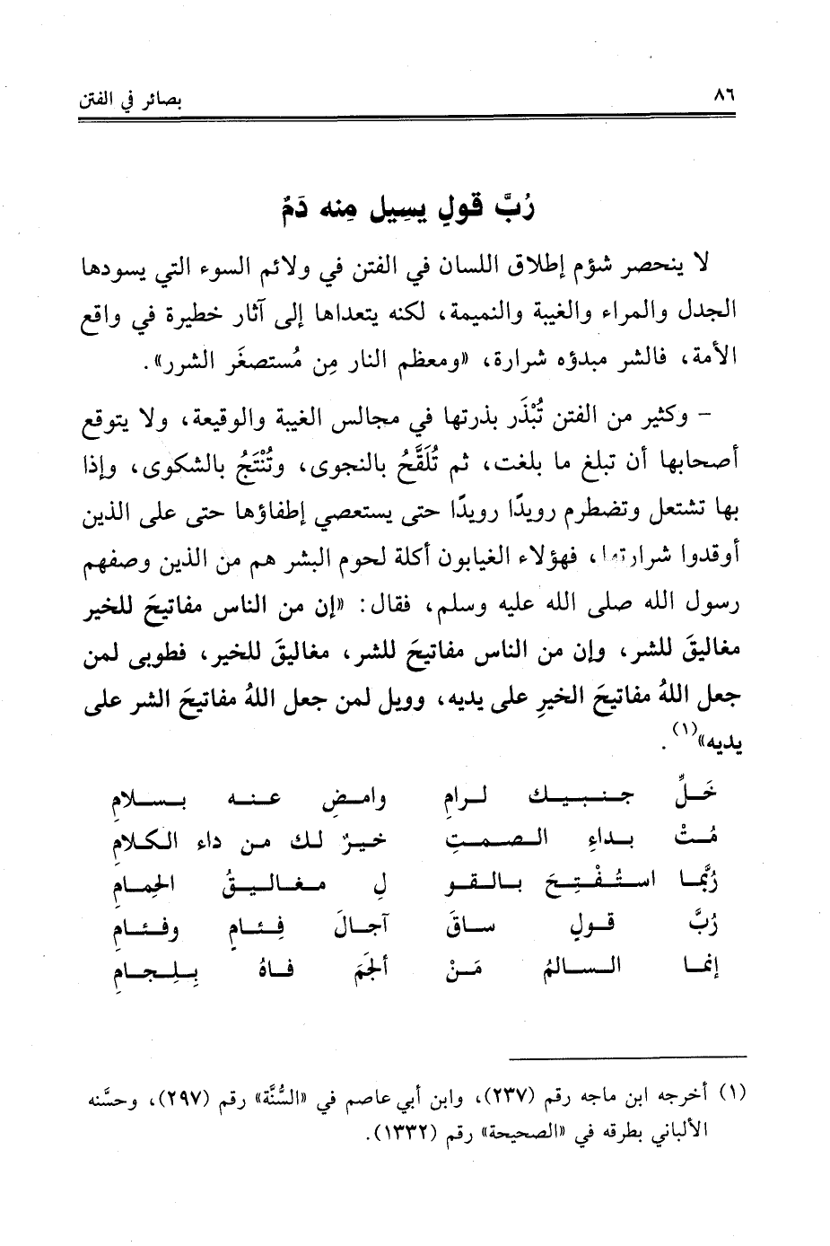لا ينحصر شؤم إطلاق اللسان في الفتن في ولائم السوء التي يسودها الجدل والمراء والغيبة والنميمة، لكنه يتعداها إلى آثار خطيرة في واقع الأمة، فالشر مبدؤه شرارة، "ومعظم النار مِن مُستصغَر الشرر".