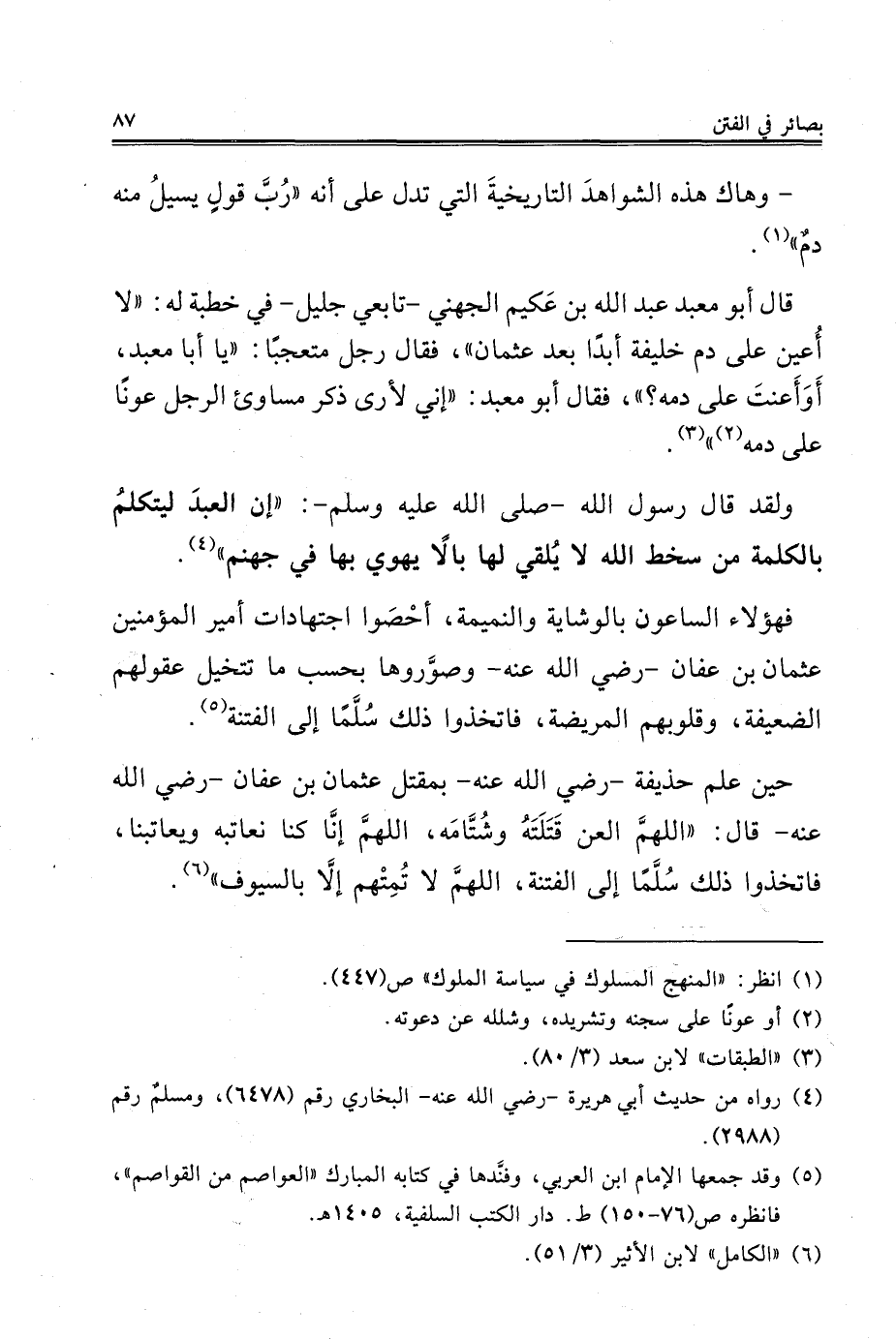 قال أبو معبد عبد الله بن عَكيم الجهني -تابعي جليل- في خطبة له: "لا أُعين على دم خليفة أبدًا بعد عثمان"، فقال رجل متعجبًا: "يا أبا معبد، أَوَأَعنتَ على دمه؟ "، فقال أبو معبد: "إني لأرى ذكر مساوئ الرجل عونًا على دمه (¬2) " (¬3).