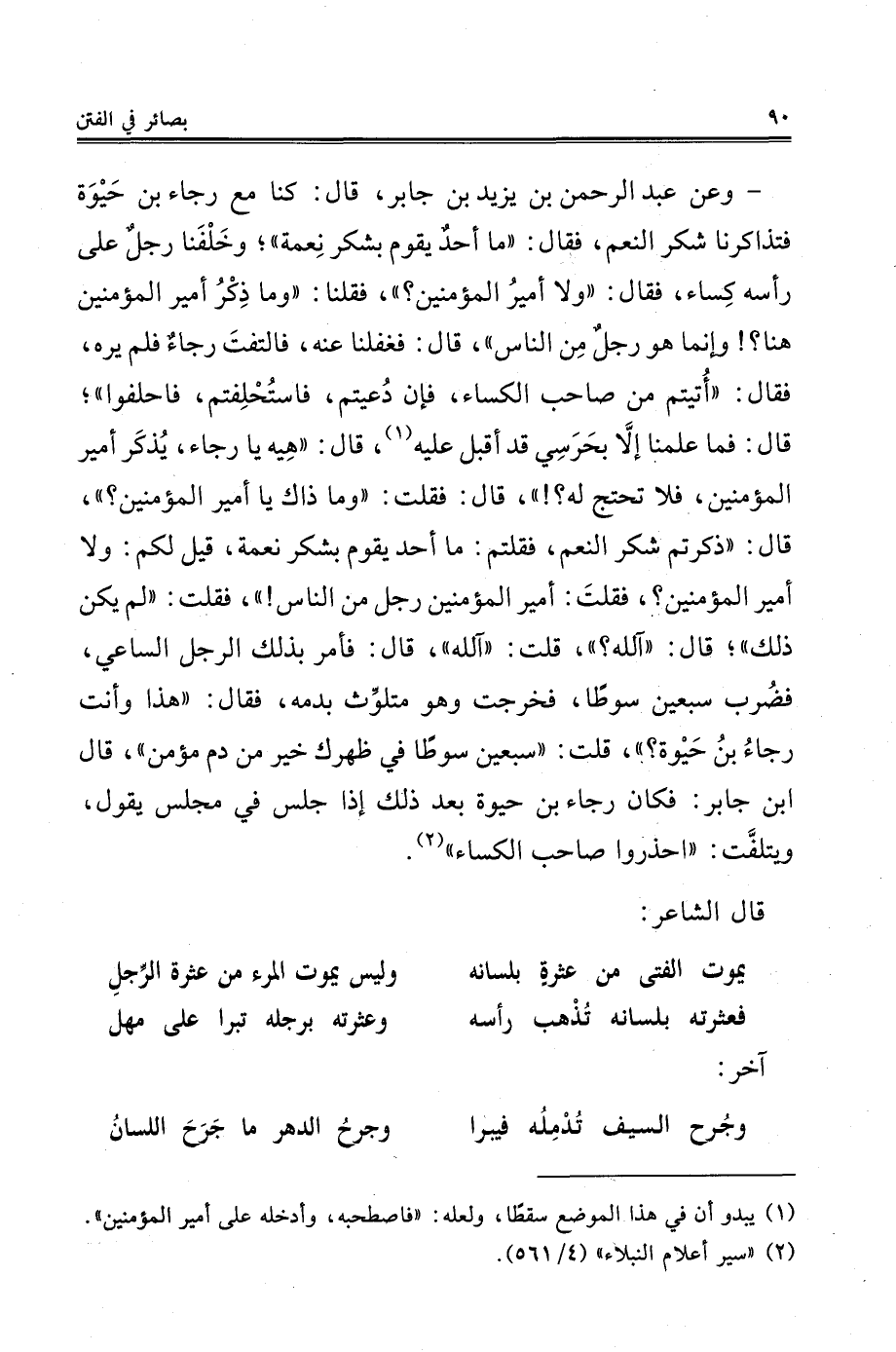 - وعن عبد الرحمن بن يزيد بن جابر، قال: كنا مع رجاء بن حَيْوَة فتذاكرنا شكر النعم، فقال: "ما أحدٌ يقوم بشكر نِعمة"؛ وخَلْفَنا رجلٌ على رأسه كِساء، فقال: "ولا أميرُ المؤمنين؟ "، فقلنا: "وما ذِكْرُ أمير المؤمنين هنا؟! وانما هو رجلٌ مِن الناس"، قال: فغفلنا عنه، فالتفتَ رجاءٌ فلم يره، فقال: "أُتيتم من صاحب الكساء، فإن دُعيتم، فاستُحْلِفتم، فاحلفوا"؛ قال: فما علمنا إلَّا بحَرَسِي قد أقبل عليه (¬1)، قال: "هِيه يا رجاء، يُذكَر أمير المؤمنين، فلا تحتج له؟! "، قال: فقلت: "وما ذاك يا أمير المؤمنين؟ "، قال: "ذكرتم شكر النعم، فقلتم: ما أحد يقوم بشكر نعمة، قيل لكم: ولا أمير المؤمنين؟، فقلتَ: أمير المؤمنين رجل من الناس! "، فقلت: "لم يكن ذلك"؛ قال: "آلله؟ "، قلت: "آلله"، قال: فأمر بذلك الرجل الساعي، فضُرب سبعين سوطًا، فخرجت وهو متلوِّث بدمه، فقال: "هذا وأنت رجاءُ بنُ حَيْوة؟ "، قلت: "سبعين سوطًا في ظهرك خير من دم مؤمن"، قال ابن جابر: فكان رجاء بن حيوة بعد ذلك إذا جلس في مجلس يقول، ويتلفَّت: "احذروا صاحب الكساء" (¬2).