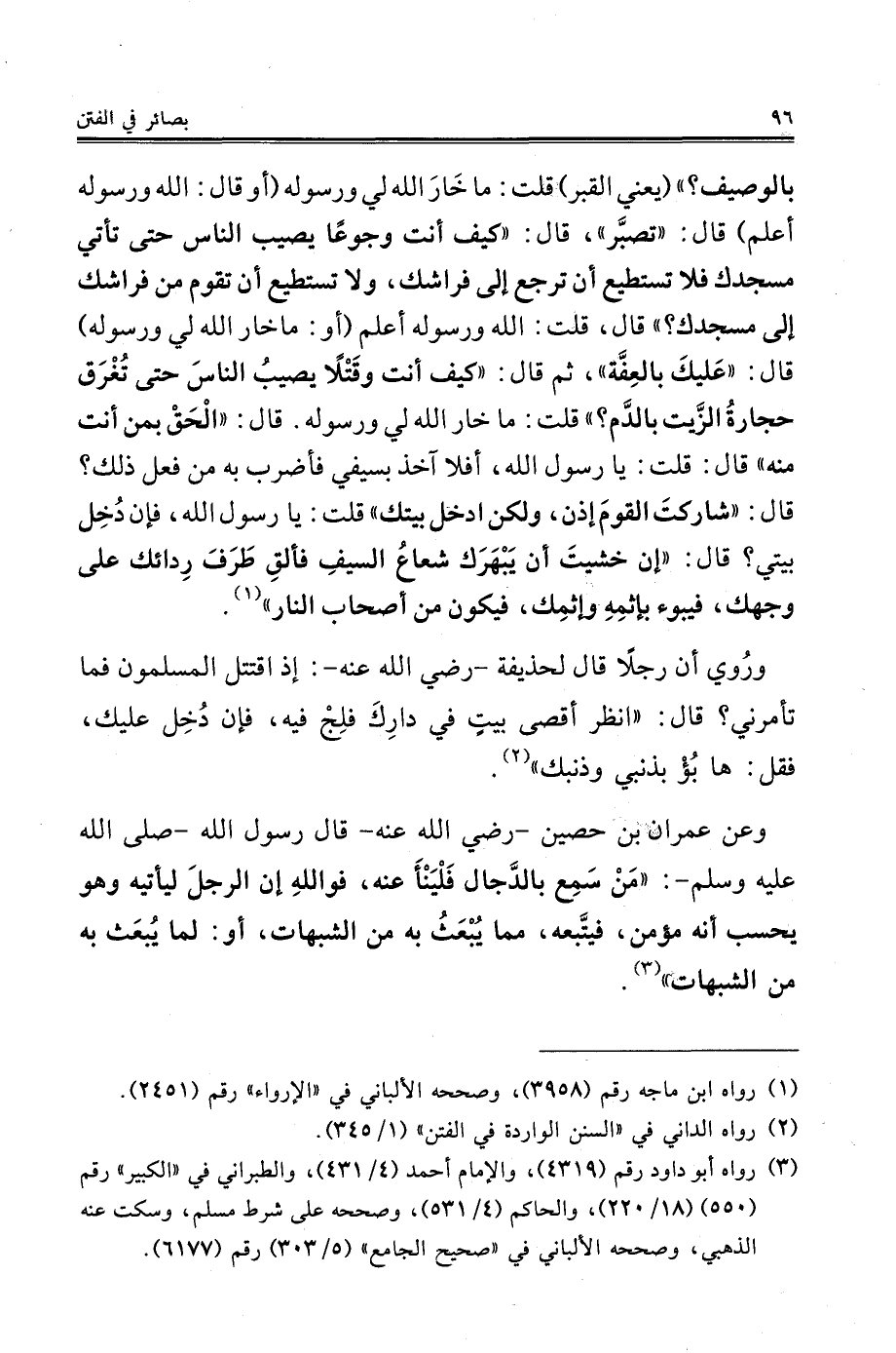 بالوصيف؟ " (يعني القبر) قنت: ما خَارَ الله لي ورسوله (أو قال: الله ورسوله أعلم) قال: "تصبَّر"، قال: "كيف أنت وجوعًا يصيب الناس حتى تأتي مسجدك فلا تستطيع أن ترجع إلى فراشك، ولا تستطيع أن تقوم من فراشك إلى مسجدك؟ " قال، قلت: الله ورسوله أعلم (أو: ما خار الله لي ورسوله" قال: "عَليكَ بالعِفَّة"، ثم قال: "كيف أنت وقَتْلًا يصيبُ الناسَ حتى تُغْرَق حجارةُ الزَّيت بالدَّم؟ " قلت: ما خار الله لي ورسوله. قال: "الْحَقْ بمن أنت منه" قال: قلت: يا رسول الله، أفلا آخذ بسيفي فأضرب به من فعل ذلك؟ قال: "شاركتَ القومَ إذن، ولكن ادخل بيتك" قلت: يا رسول الله، فإن دُخِل بيتي؟ قال: "إن خشيتَ أن يَبْهَرَك شعاعُ السيفِ فألقِ طَرَفَ رِدائك على وجهك، فيبوء بإثمِهِ وإثمِك، فيكون من أصحاب النار" (¬1).