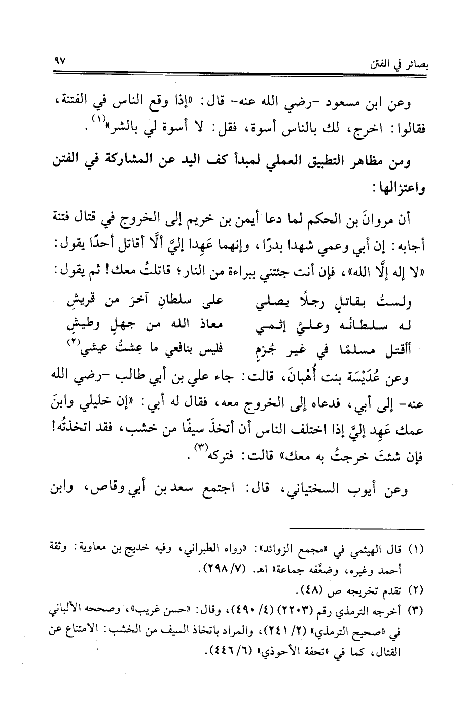 ومن مظاهر التطبيق العملي لمبدأ كف اليد عن المشاركة في الفتن واعتزالها: