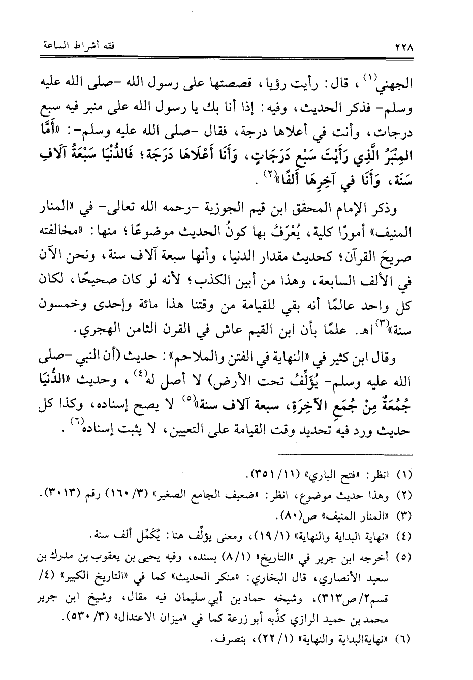 وذكر الإمام المحقق ابن قيم الجوزية -رحمه الله تعالى- في "المنار المنيف" أمورًا كلية، يُعْرَفُ بها كونُ الحديث موضوعا؛ منها: "مخالفته صريحَ القرآن؛ كحديث مقدار الدنيا، وأنها سبعة آلاف سنة، ونحن الآن في الألف السابعة، وهذا من أبين الكذب؛ لأنه لو كان صحيحًا، لكان كل واحد عالمًا أنه بقي للقيامة من وقتنا هذا مائة وإحدى وخمسون سنة" (¬3) اهـ. علمًا بأن ابن القيم عاش في القرن الثامن الهجري.