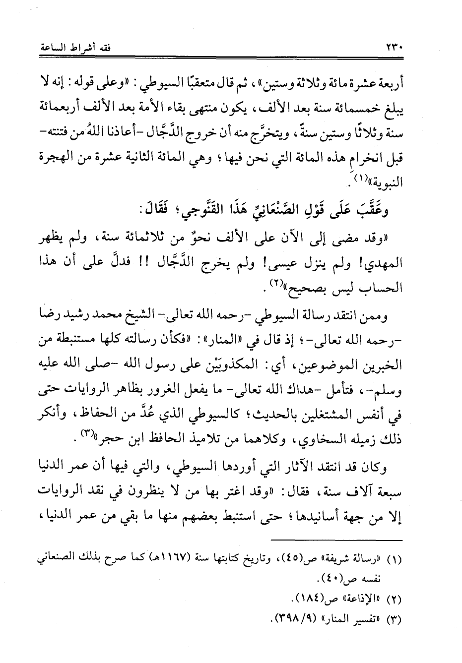 وممن انتقد رسالة السيوطي -رحمه الله تعالى- الشيخ محمد رشيد رضا -رحمه الله تعالى-؛ إذ قال في "المنار": "فكأن رسالته كلها مستنبطة من الخبرين الموضوعين، أي: المكذوبَيْن على رسول الله -صلى الله عليه وسلم-، فتأمل -هداك الله تعالى- ما يفعل الغرور بظاهر الروايات حتى في أنفس المشتغلين بالحديث؛ كالسيوطي الذي عُدَّ من الحفاظ، وأنكر ذلك زميله السخاوي، وكلاهما من تلاميذ الحافظ ابن حجر" (¬3).