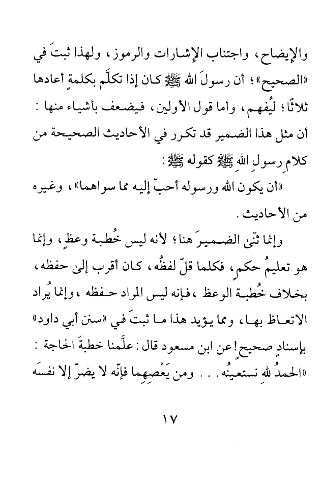 والإيضاح واجتناب الإشارات والرموز ولهذا ثبت في الصحيح أن رسول الله صلى الله عليه وسلم كان إذا تكلم أعادها ثلاثا ليفهم وأما قول الأولين فيضعف بأشياء منها: أن مثل هذا الضمير قد تكرر في الأحاديث الصحيحة من كلام رسول الله صلى الله عليه وسلم كقوله صلى الله عليه وسلم: