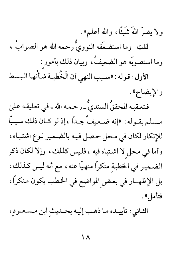 فتعقبه المحقق السندي - رحمه الله - في تعليقه على مسلم بقوله: "إنه ضعيف جدا إذ لو كان ذلك سببا للإنكار لكان في محل حصل فيه بالضمير نوع اشتباه وأما في محل لا اشتباه فيه فليس كذلك وإلا لكان ذكر الضمير في الخطبة منكرا منهيا عنه مع أنه ليس كذلك بل الإظهار في بعض المواضع في الخطب يكون منكرا فتأمل".