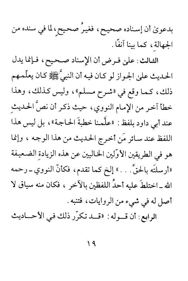 الثالث: على فرض أن الإسناد صحيح إنما يدل الحديث على الجواز لو كان فيه أن النبي صلى الله عليه وسلم كان يعلمهم ذلك كما وقع في "شرح مسلم" وليس كذلك وهذا خطأ آخر من الإمام النووي حيث ذكر أن نص الحديث عن أبي داود بلفظ: "علمنا خطبة الحاجة ... " بل ليس هذا اللفظ عند سائر من أخرج الحديث من هذا الوجه وإنما هو في الطريقين الأولين الخاليين عن هذه الزيادة الضعيفة: "أرسلته بالحق ... " الخ كما تقدم فكأن النووي - رحمه الله - اختلط عليه أحد اللفظين بالآخر فكان منه سياق لا أصل له في شيء من الروايات فتنبه