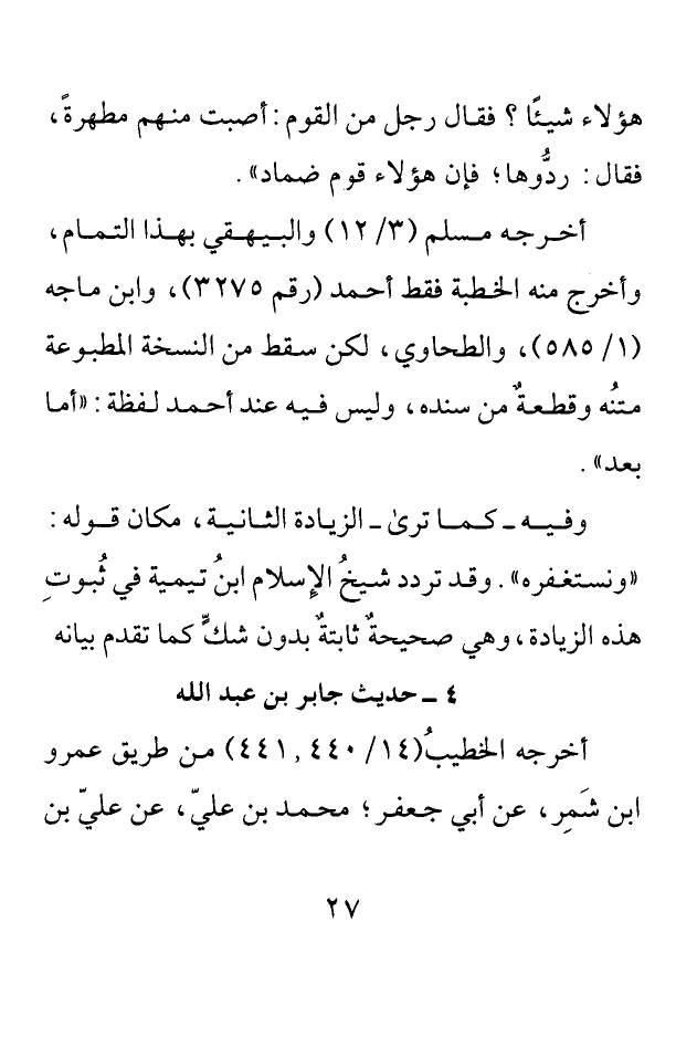 وفيه - كما - ترى الزيادة الثانية مكان قوله: "ونستغفره ".وقد تردد شيخ الإسلام ابن تيمية في ثبوت هذه الزيادة وهي صحيحة ثابتة بدون شك كما تقدم بيانه