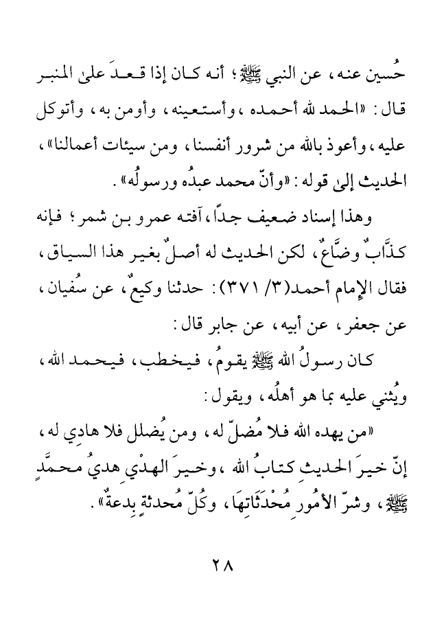 "من يهده الله فلا مضل له ومن يضلل فلا هادي له إن خير الحديث كتاب الله وخير الهدي هدي محمد صلى الله عليه وسلم وشر الأمور محدثاتها وكل محدثة بدعة".