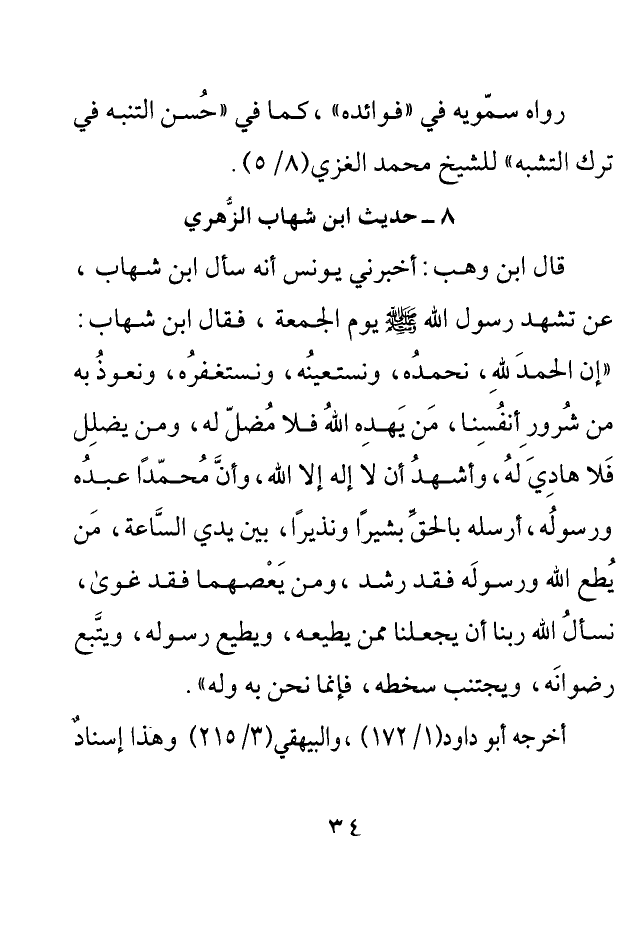 قال ابن وهب ب: أخبرني يونس أنه سأل ابن شهاب عن تشهد رسول الله صلى الله عليه وسلم يوم الجمعة فقال ابن شهاب: "إن الحمد لله نحمده ونستعينه ونستغفره ونعوذ به من شرور أنفسنا من يهده الله فلا مضل له ومن يضلل فلا هادي له وأشهد أن لا إله إلا الله وأن محمدا عبده ورسوله أرسله بالحق بشيرا ونذيرا بين يدي الساعة من يطع الله ورسوله فقد رشد ومن يعصهما فقد غوى نسأل الله ربنا أن يجعلنا ممن يطيعه ويطيع رسوله ويتبع رضوانه ويجتنب سخطه فإنما نحن به وله".