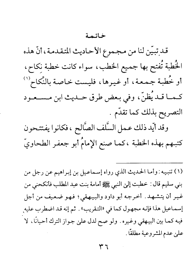 1 تنبيه: وأما الحديث الذي رواه إسماعيل بن إبراهيم عن رجل من بني سليم قال: خطبت إلى النبي صلى الله عليه وسلم أمامة بنت عبد المطلب فأنكحني من غير أن يتشهد. أخرجه أبو داود والبيهقي فهو ضعيف من أجل إسماعيل هذا فإنه مجهول كما في "التقريب". ثم إنه قد اضطرب عليه فيه كما بين البيهقي وغيره. ولو صح لدل على جواز الترك أحيانا لا على عدم المشروعية مطلقا